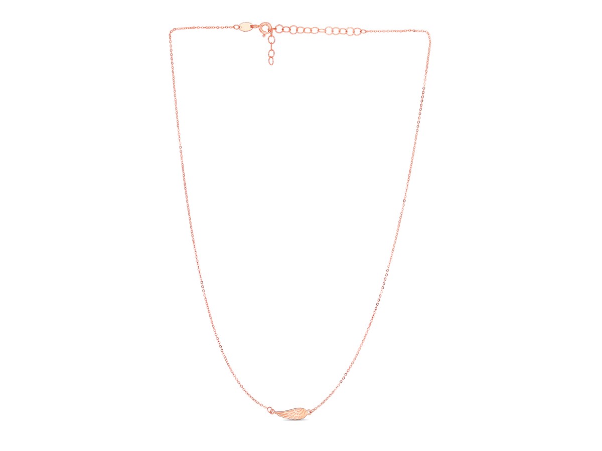 A beautiful, feathery angel wing flutters gracefully on a uniquely gorgeous 14K rose gold chain necklace. Necklace is 18 inches long and 1mm wide. Angel wing symbol measures 4.5x16.7mm.