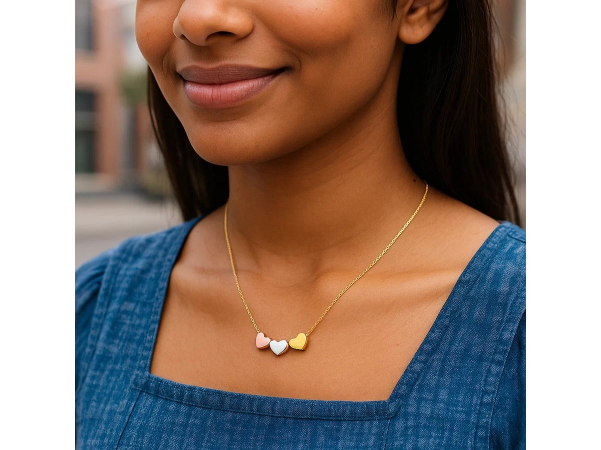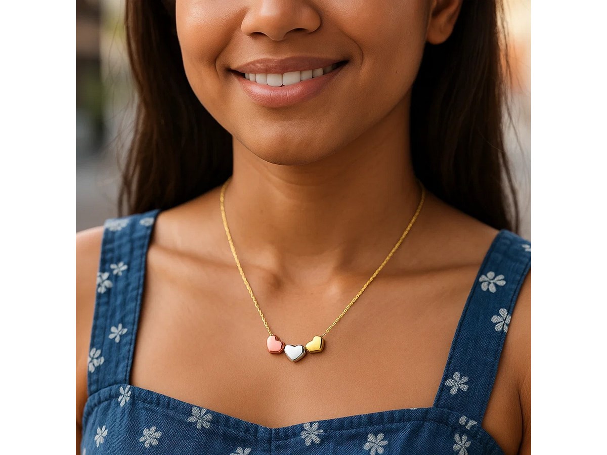 This 14K tri-color gold triple heart necklace features intertwined yellow, white, and rose gold hearts on a delicate chain. Its mixed-metal shine and romantic design make it a versatile, meaningful piece perfect for everyday wear or gifting.