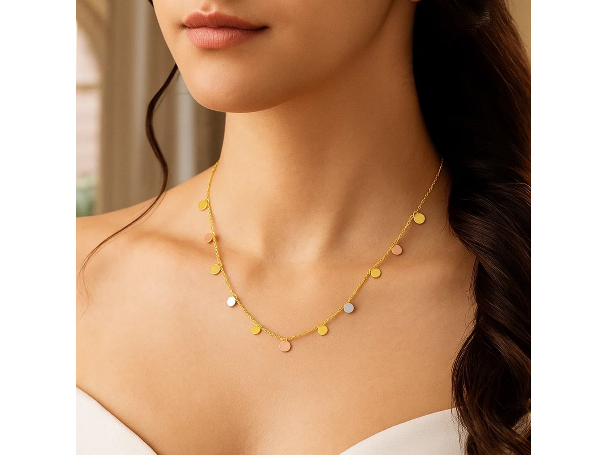 Twinkling circles in 14K yellow, white, and rose gold shimmer and swing from a simple chain to create this elegant necklace. Necklace is 18 inches long, 0.6mm wide, and closes with a spring ring clasp. Circle elements measure 3mm.