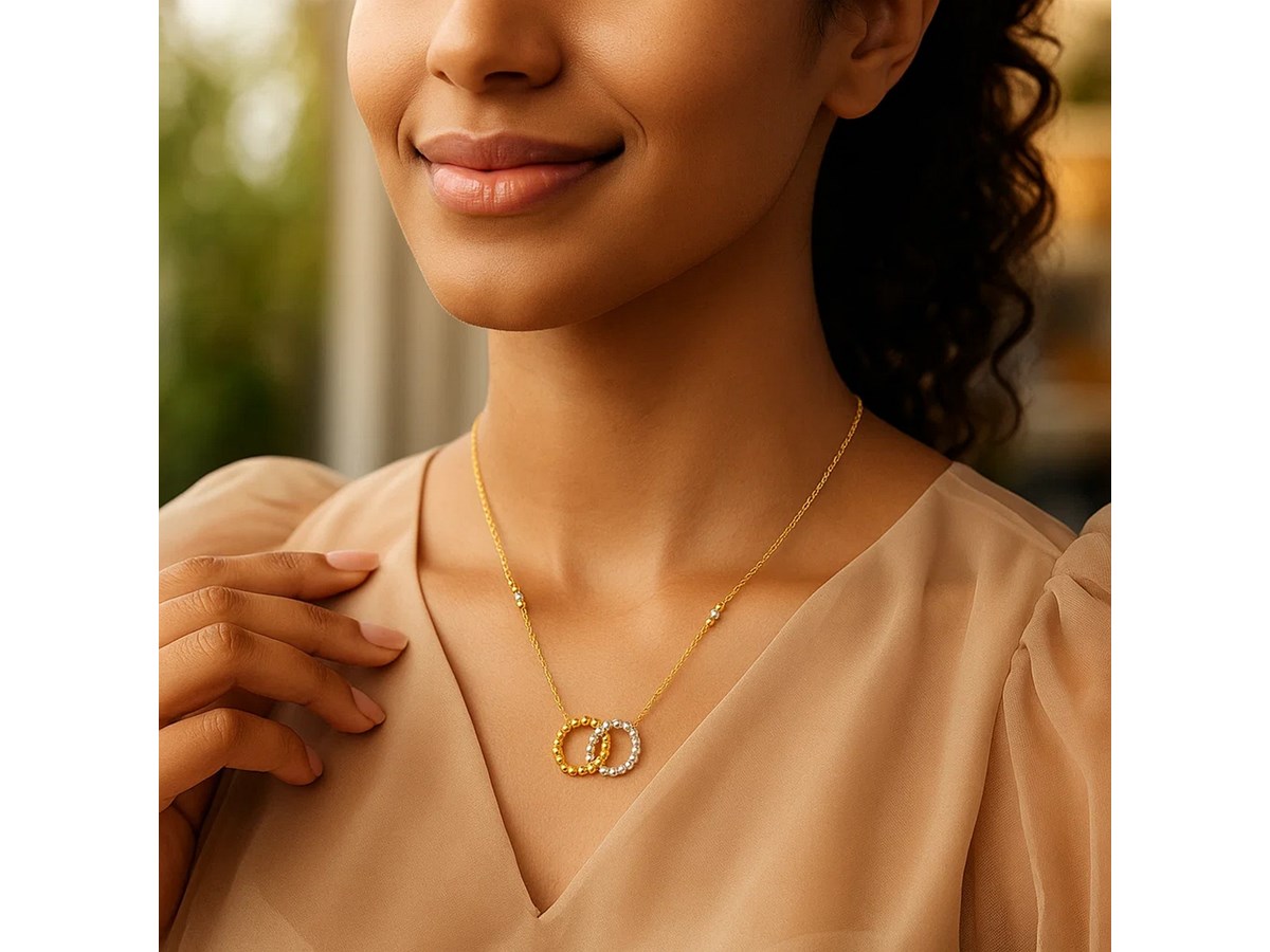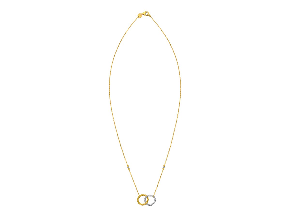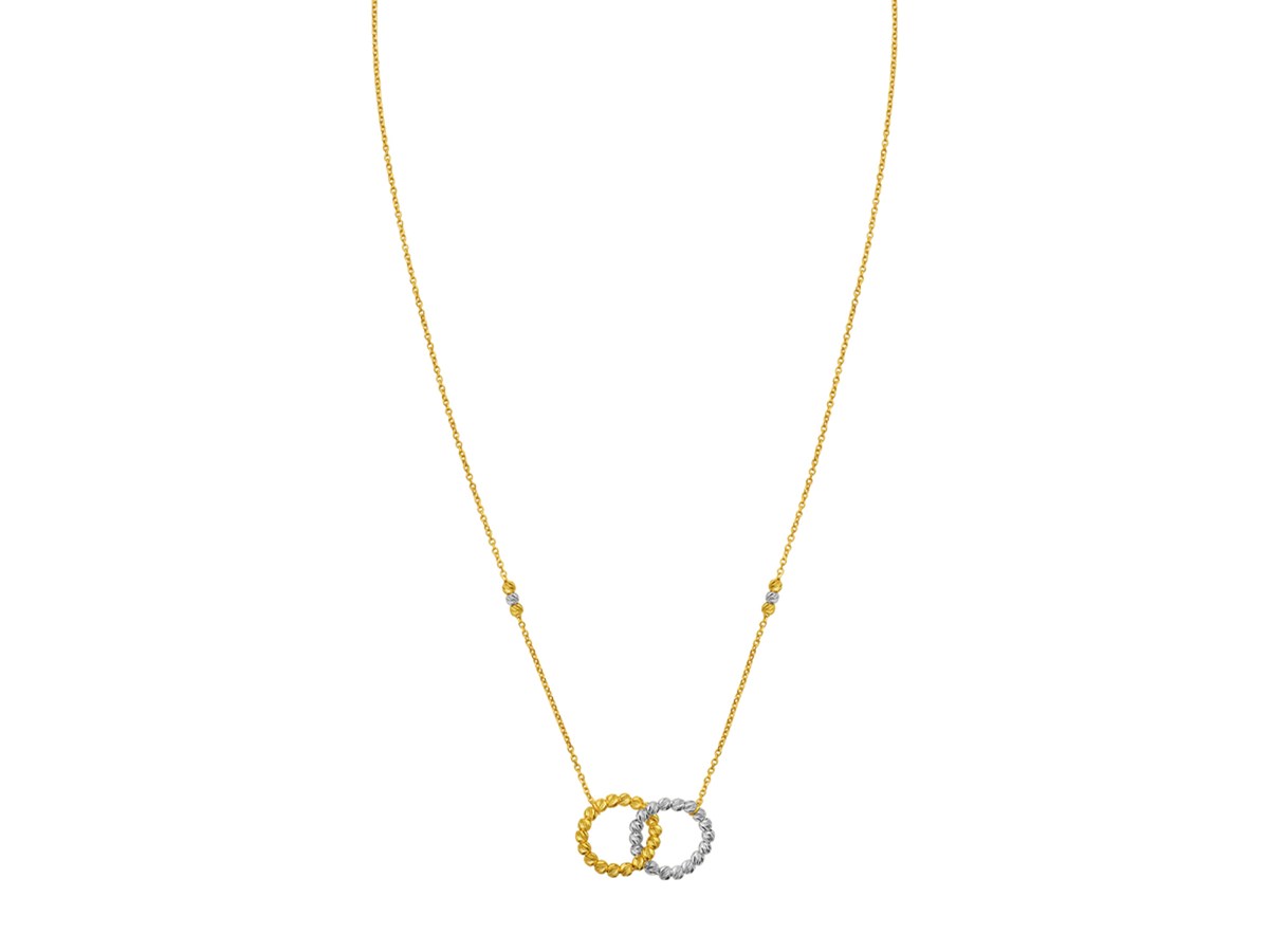 Elevate your elegance with this 14K two-tone gold necklace, featuring interlocking circles that symbolize unity and harmony. The contrasting hues of yellow and white gold create a captivating visual appeal, making it a versatile accessory suitable for any occasion. Measuring 18 inches in length, it rests gracefully on the neckline and is secured with a reliable lobster clasp. Expertly crafted for lasting beauty, this necklace is a timeless addition to your jewelry collection.