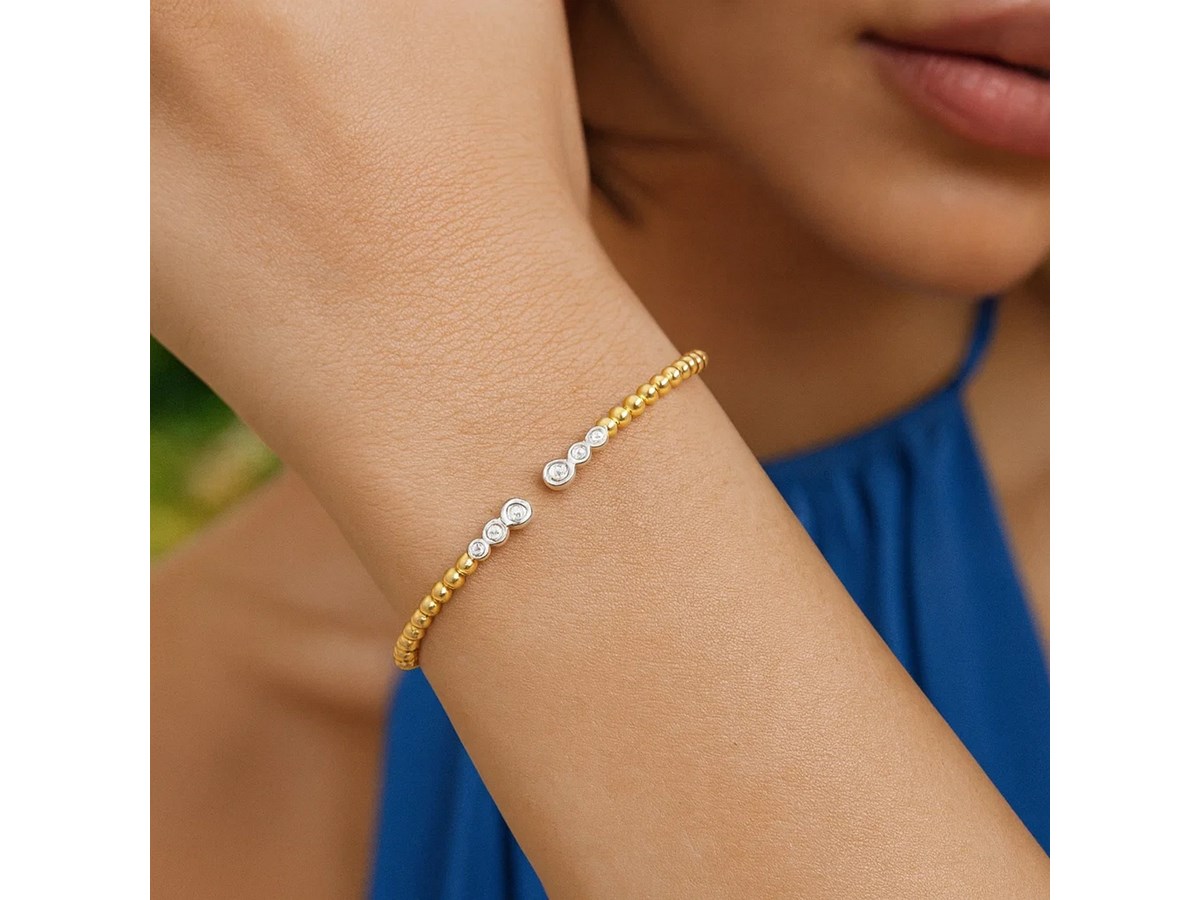 The 14K Two-Tone Polish Diamond Pallina Open Beaded Cuff Bangle (3.00 mm) features a refined beaded design crafted in polished 14K yellow and white gold. Diamond-cut accents add subtle sparkle, while the open cuff style offers easy wear and a modern, minimalist look. Perfect on its own or layered with other bracelets.
