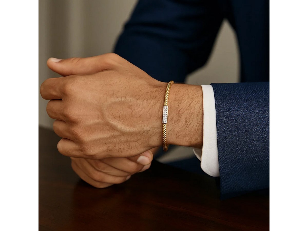 Elegant 14K two-tone gold Italian cable bracelet featuring a polished finish and a .19ct diamond-accented centerpiece. Secured with a push-in clasp, this refined design blends luxury and modern sophistication for a timeless unisex appeal.