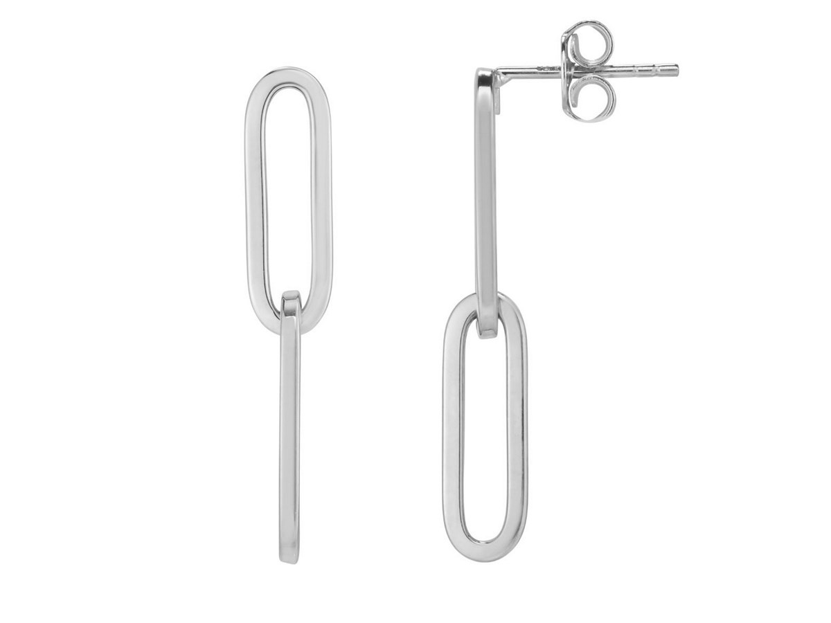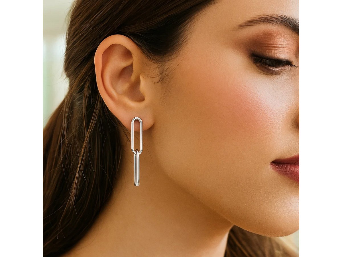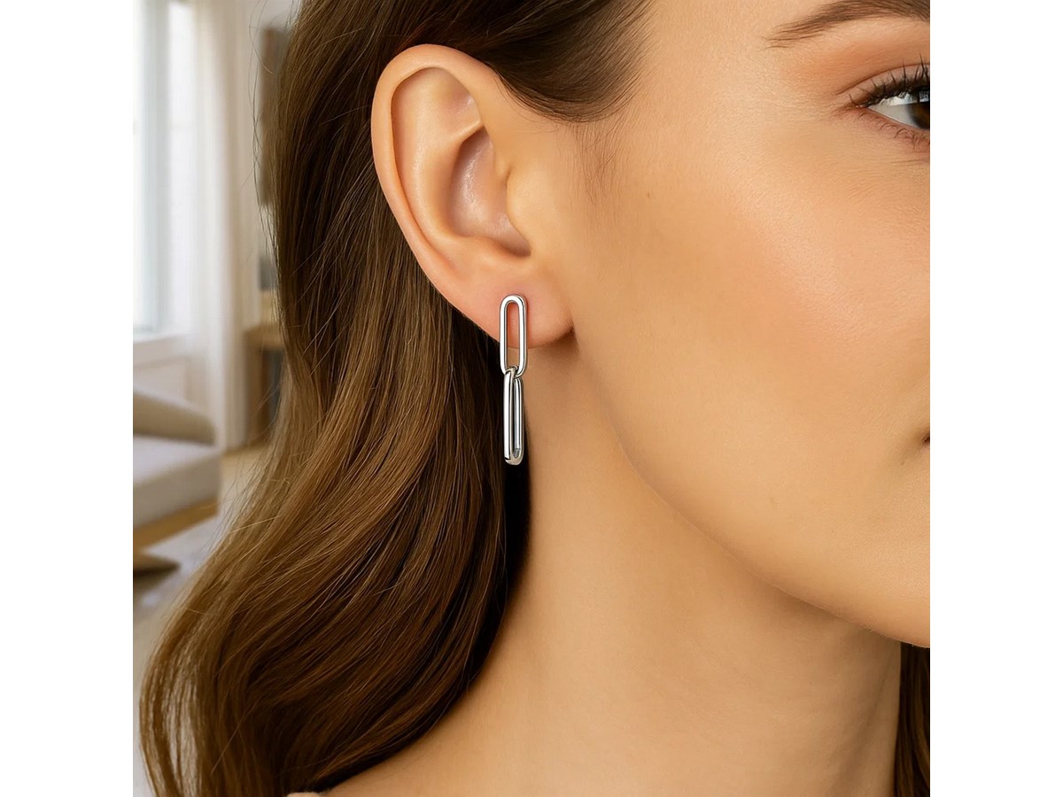Stylish 14K white gold double link paperclip drop earrings featuring a sleek polished finish. The modern interlocking link design adds a touch of sophistication and movement, making them perfect for both everyday elegance and elevated evening looks.