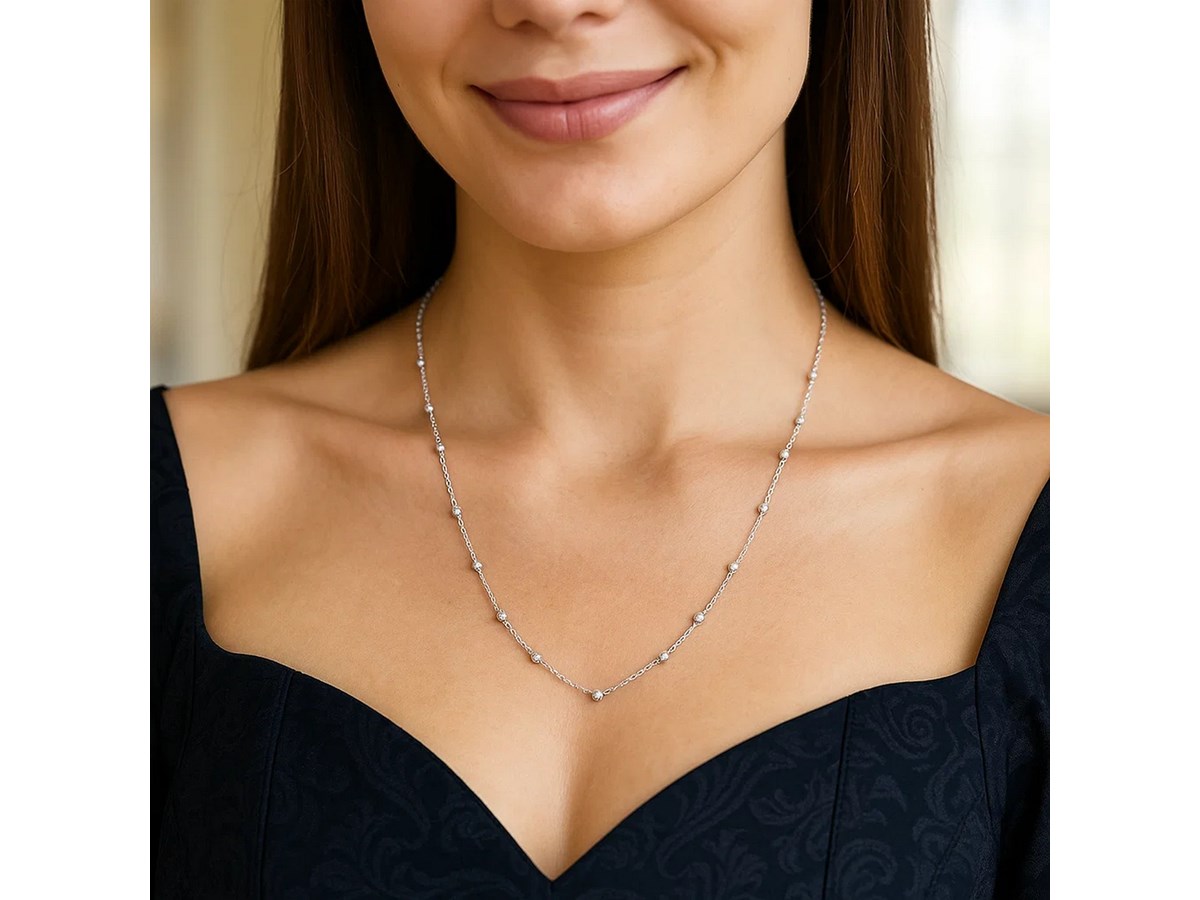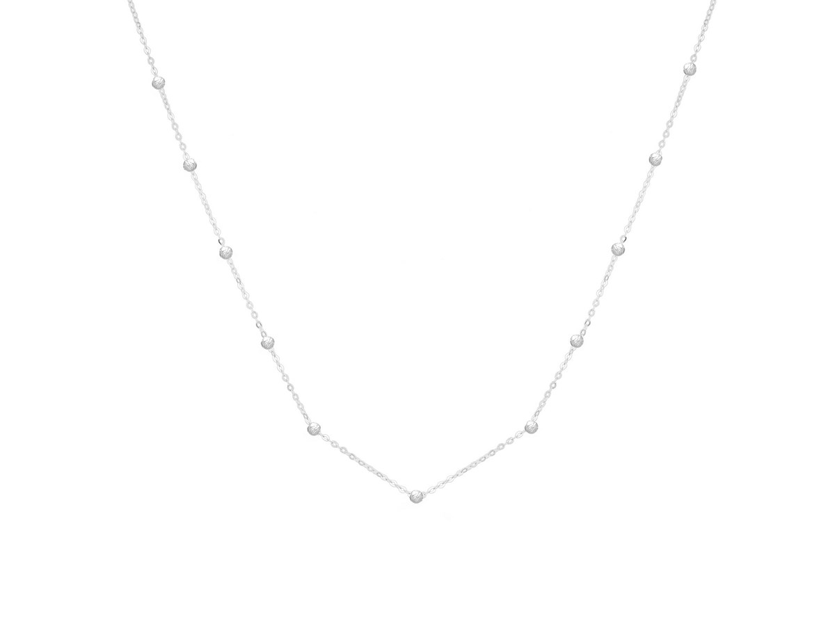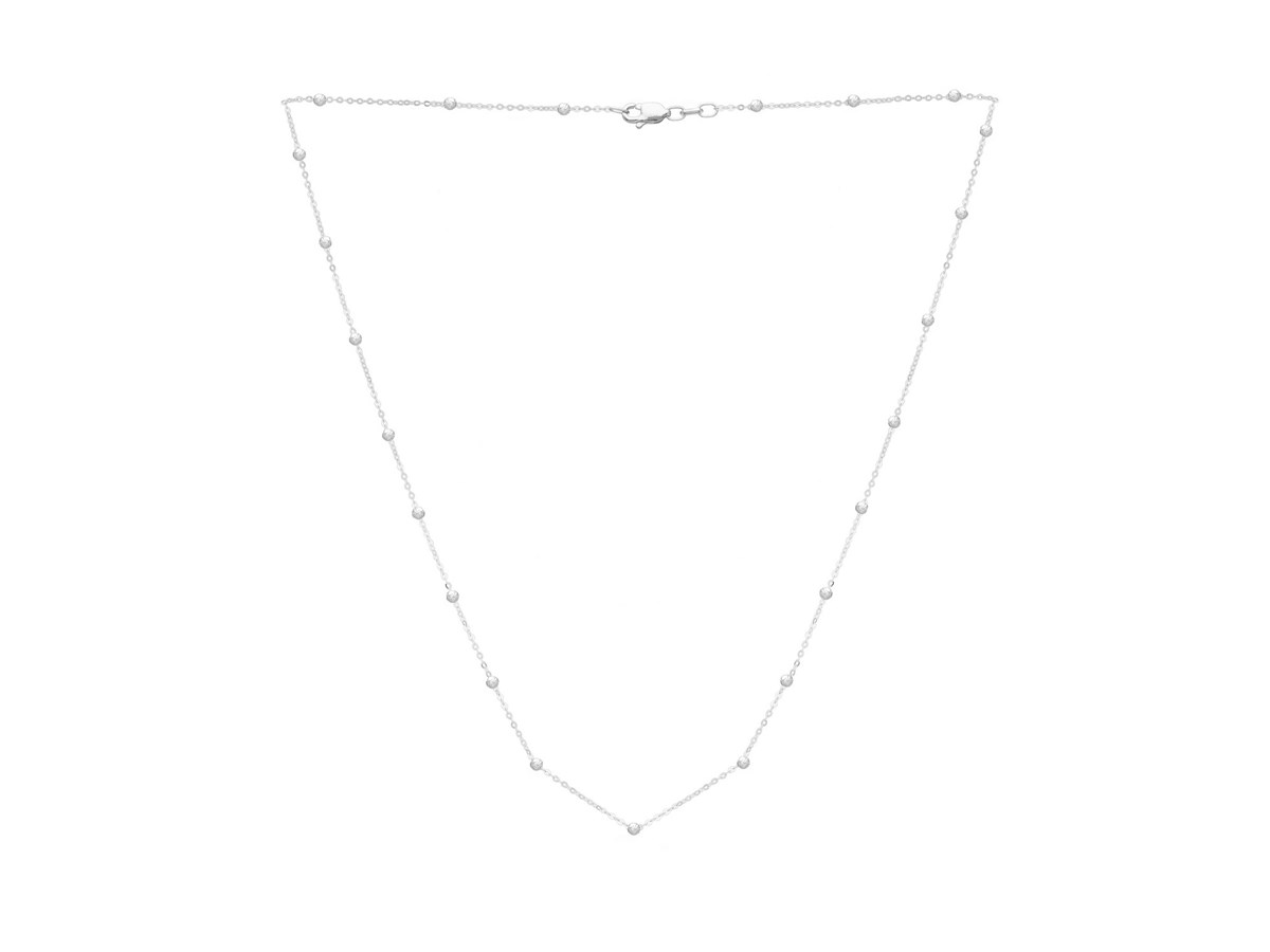 This 14K white gold Saturn bead chain necklace features evenly spaced polished beads along a sleek, shimmering chain. Its modern yet delicate design makes it perfect for everyday wear, layering, or adding a touch of refined sparkle to any look.