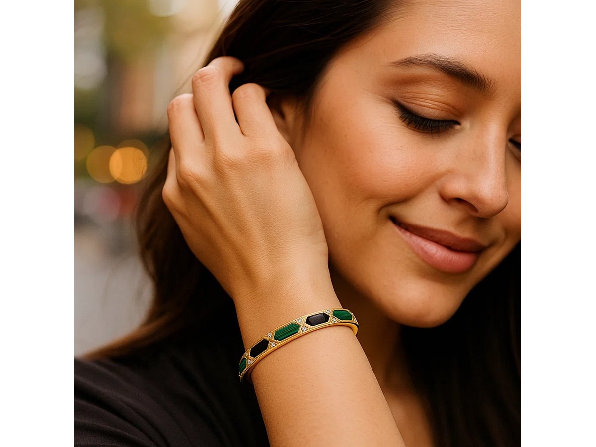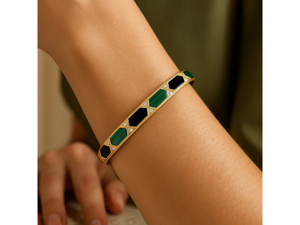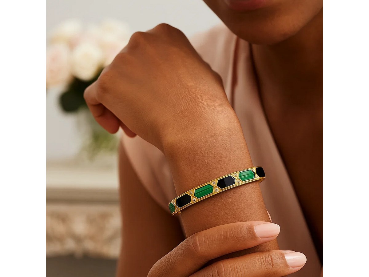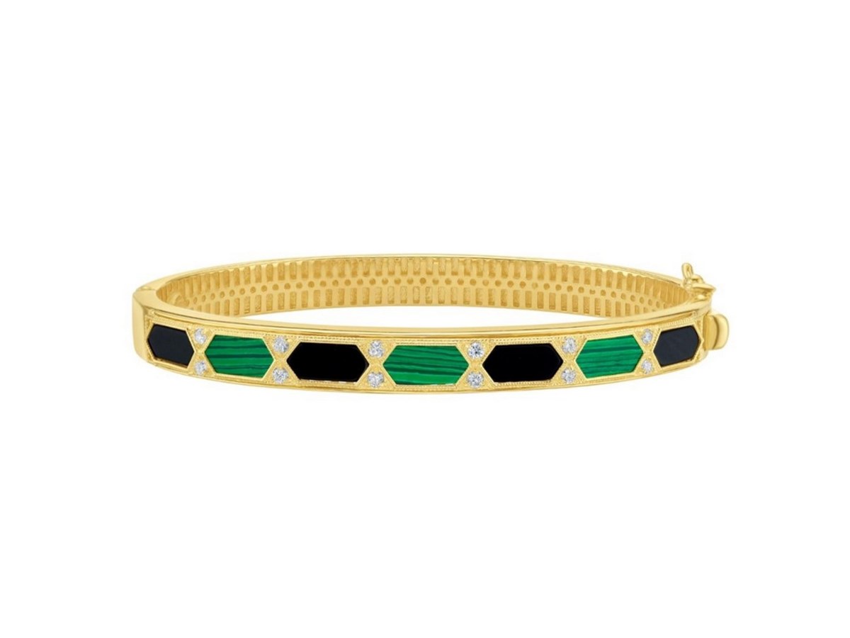 Sterling elegance in a 14K yellow gold bangle featuring a captivating Art Deco hexagon design with contrasting black onyx and rich malachite inlays. Around 0.24 cttw of brilliant diamonds add refined sparkle. Designed with a push-to-open clasp and a figure-8 safety lock for both secure and stylish wear.