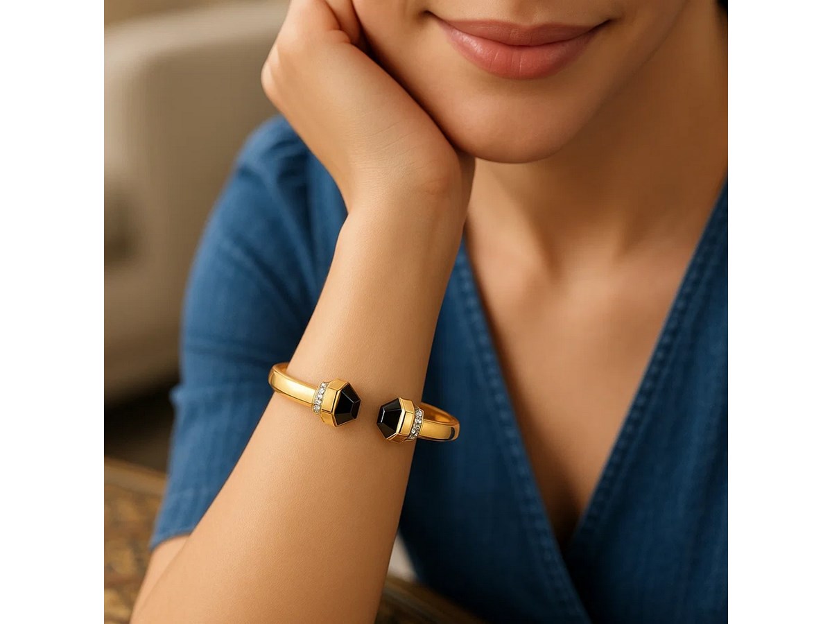 Add a bold, architectural flair to any outfit with the 14K Yellow Gold Black Pyramid Art Deco Open Cuff Bangle. This striking piece showcases polished yellow gold adorned with dramatic black onyx pyramid end accents and sparkling 0.14 cttw diamonds, elegantly merging vintage Art Deco geometry with a contemporary edge.