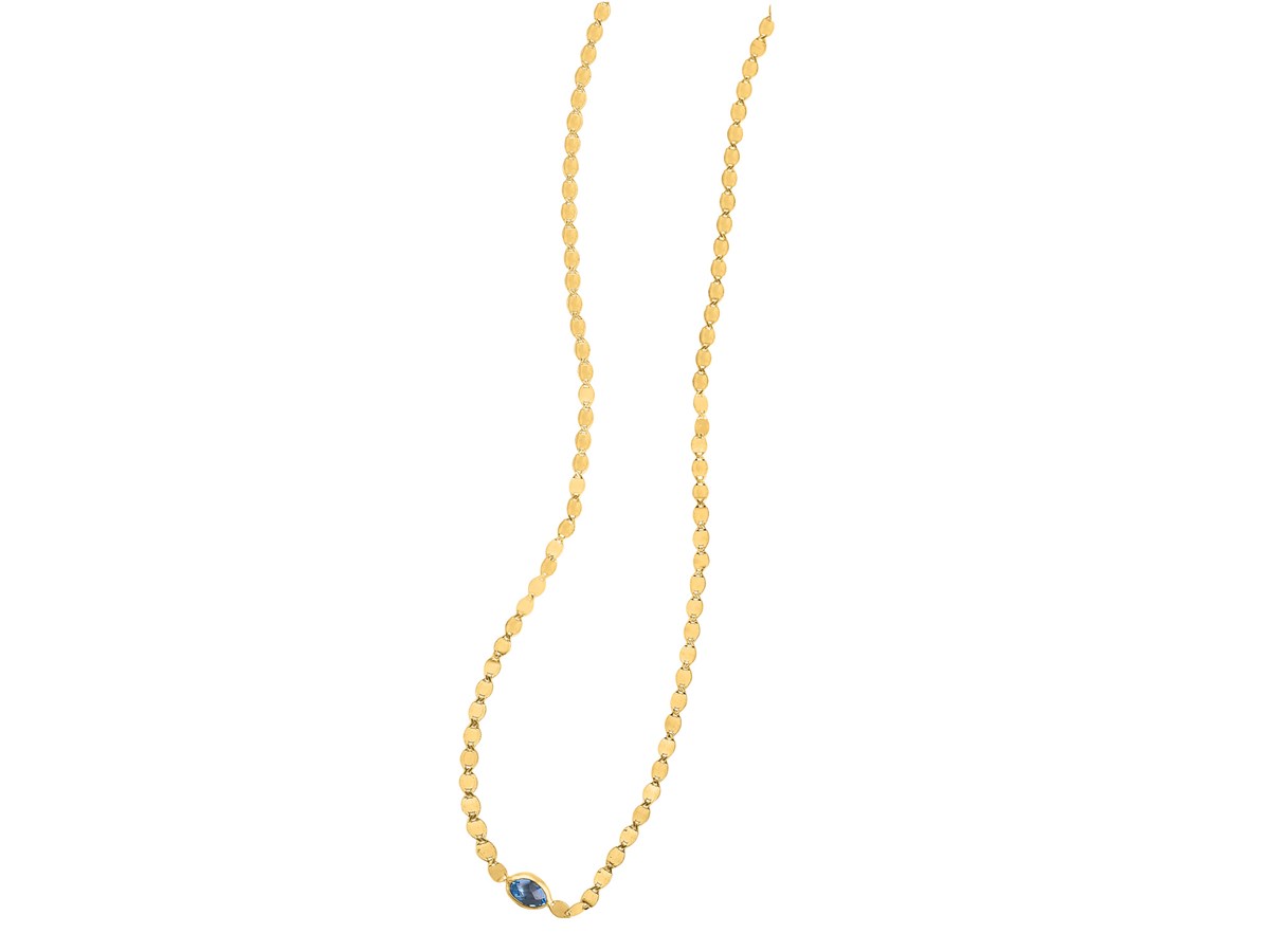 Crafted in lustrous 14K yellow gold, this elegant mirrored chain features a vivid 6×40 mm oval Blue Topaz center, adding a touch of regal color. The sleek 2.20 mm mirrored chain beautifully reflects light, creating a subtle shimmer with every movement. Measuring 16 inches in length and finished with a secure lobster clasp, this piece merges timeless craftsmanship with wearable glamour.