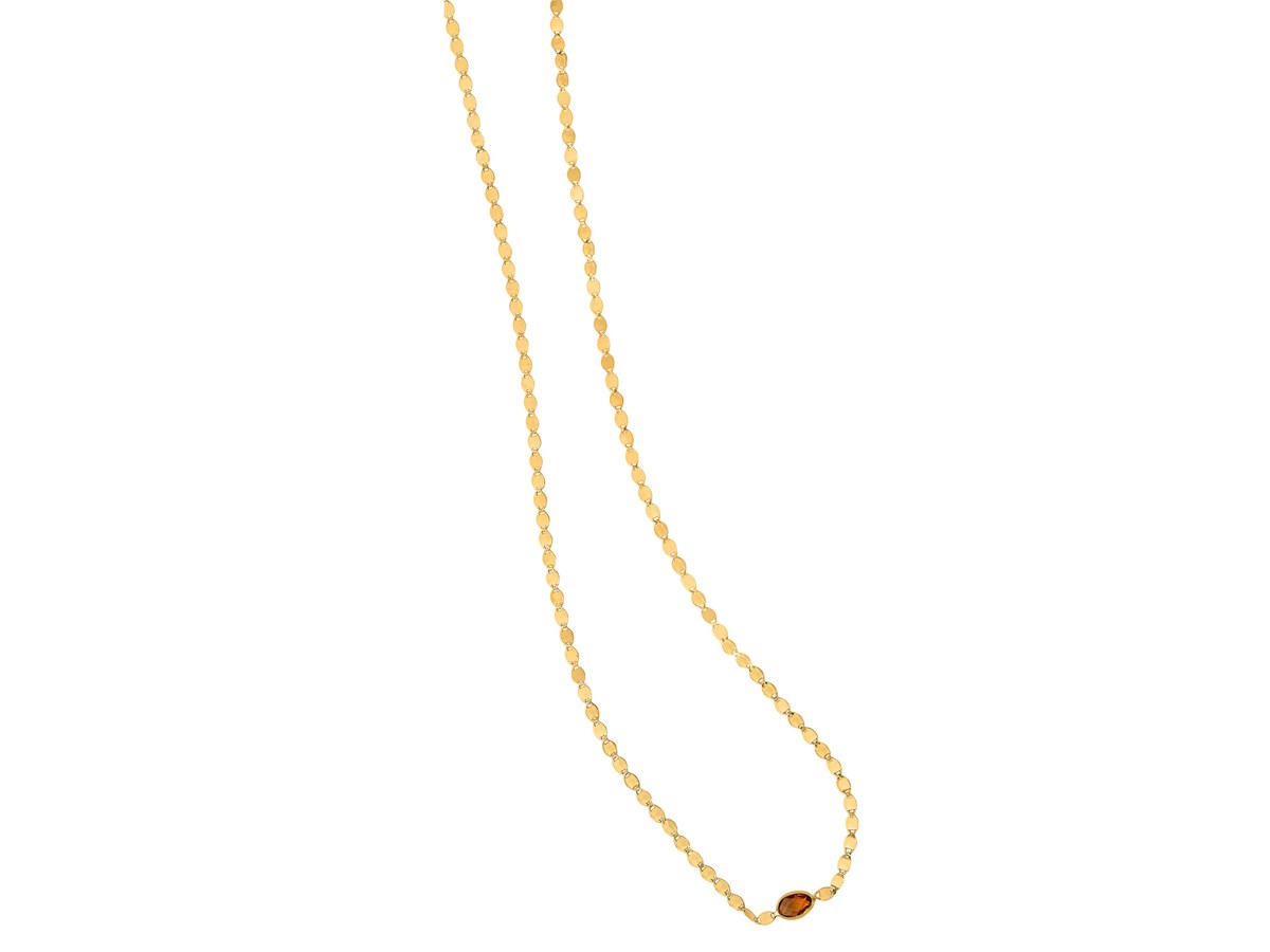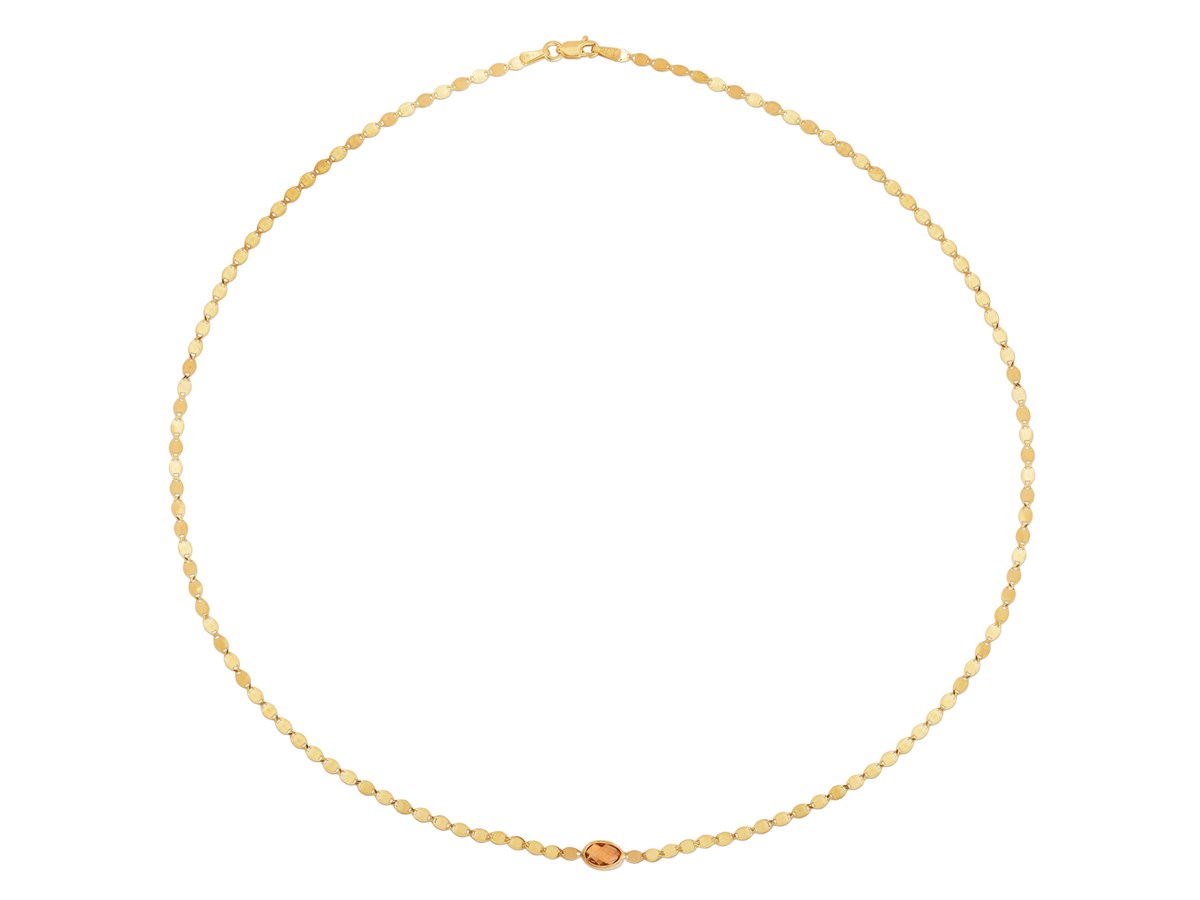 Crafted in lustrous 14K yellow gold, this elegant mirrored chain features a vivid 6×40 mm oval Citrine center, adding a touch of regal color. The sleek 2.20 mm mirrored chain beautifully reflects light, creating a subtle shimmer with every movement. Measuring 16 inches in length and finished with a secure lobster clasp, this piece merges timeless craftsmanship with wearable glamour.