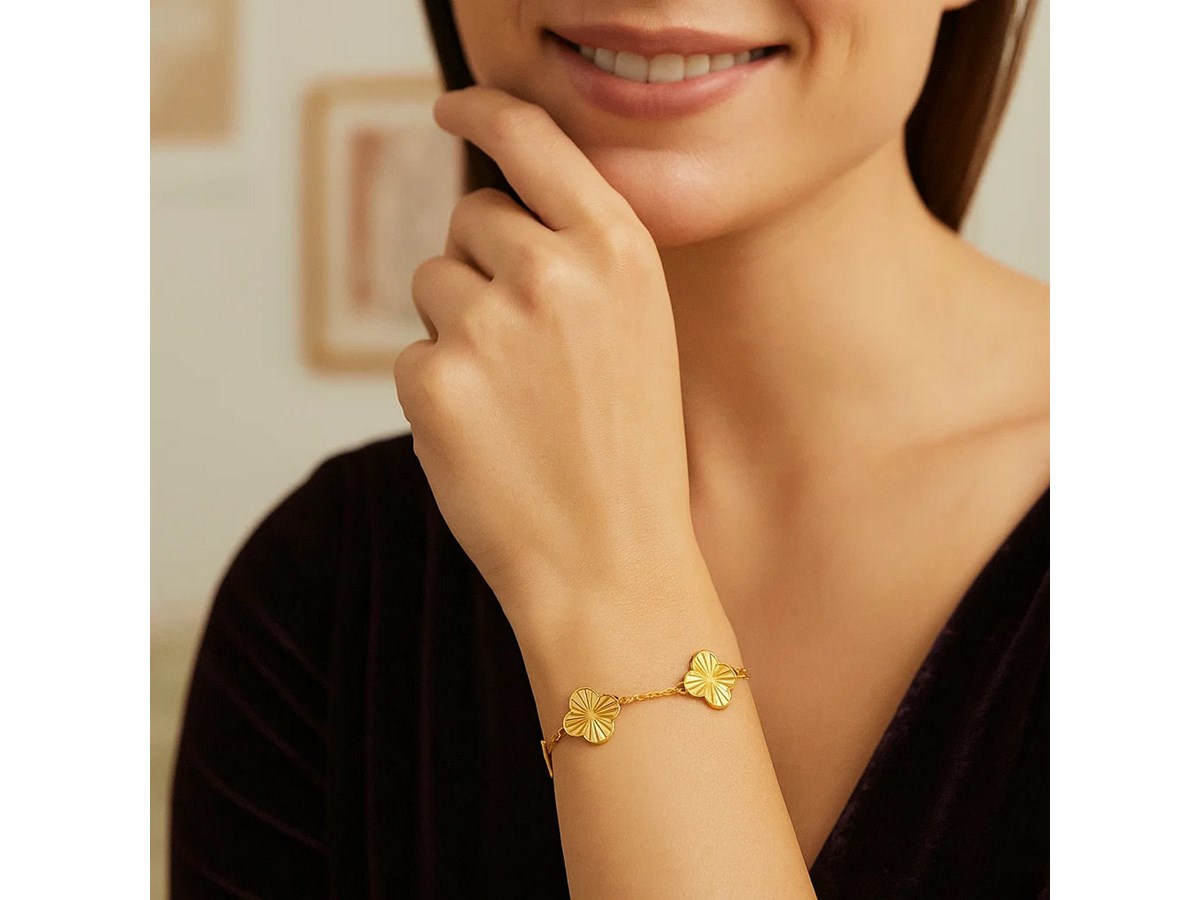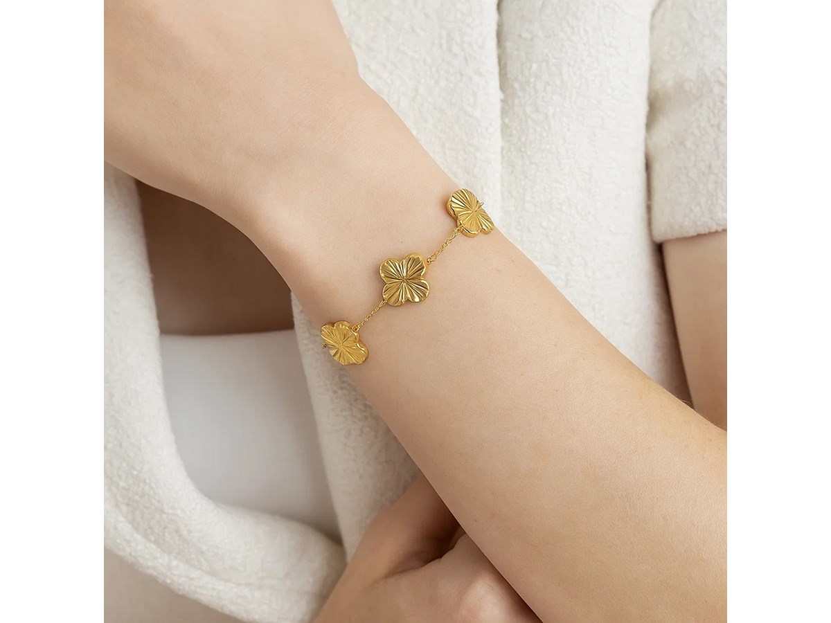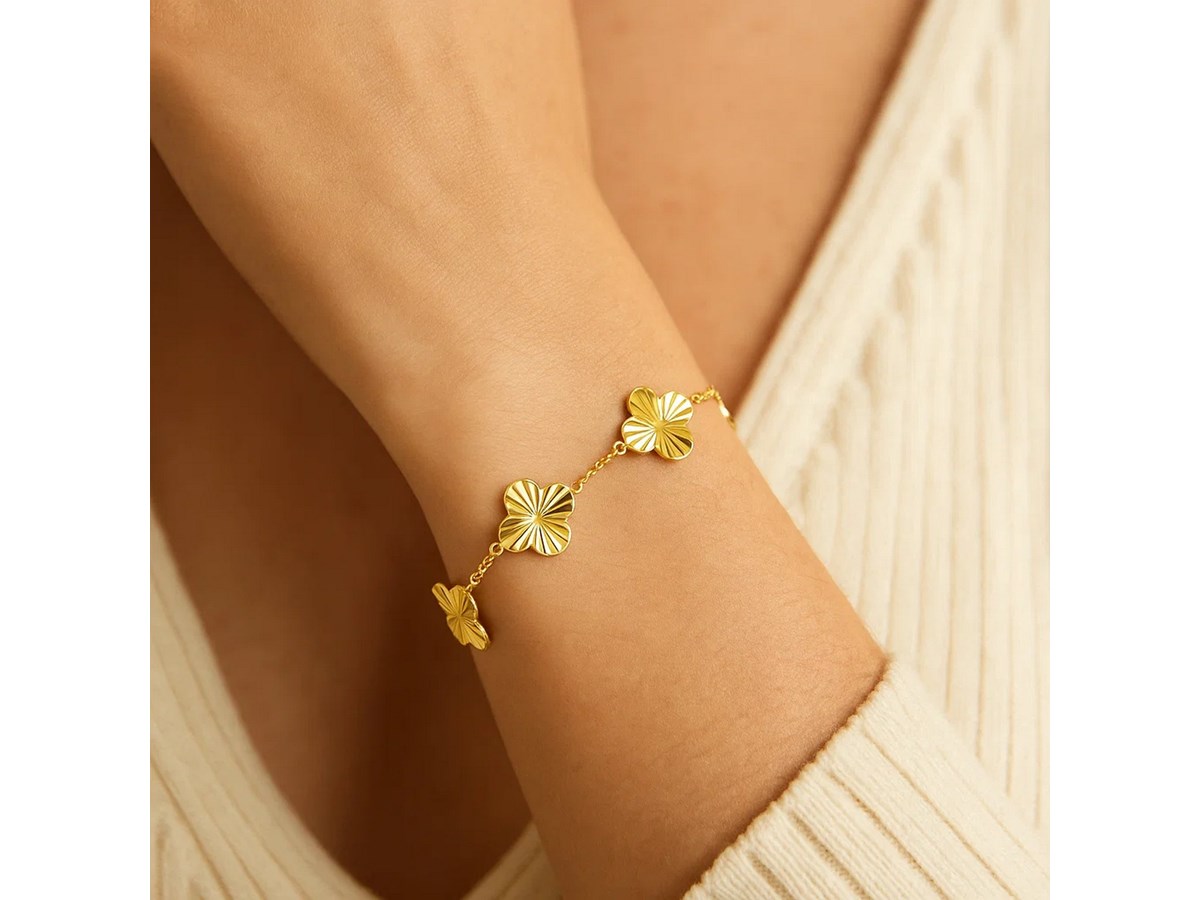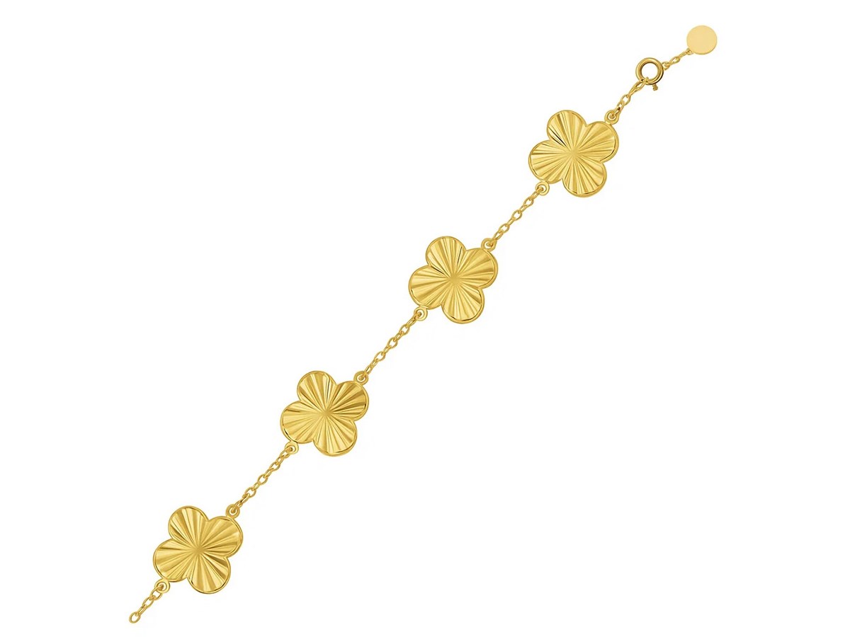 Introducing our 14K Yellow Gold Clover Bracelet, a symbol of elegance and good fortune. This 7 1/4 inches bracelet features delicate clover-shaped links, meticulously crafted to capture the timeless beauty of this iconic design. The bracelet is secured with a spring ring clasp and includes a jump ring at 6.5 inches, offering versatility for different wrist sizes. Whether worn alone for a minimalist look or layered with other pieces, this bracelet adds a touch of sophistication to any ensemble. Embrace the charm and grace of the clover with this exquisite piece.