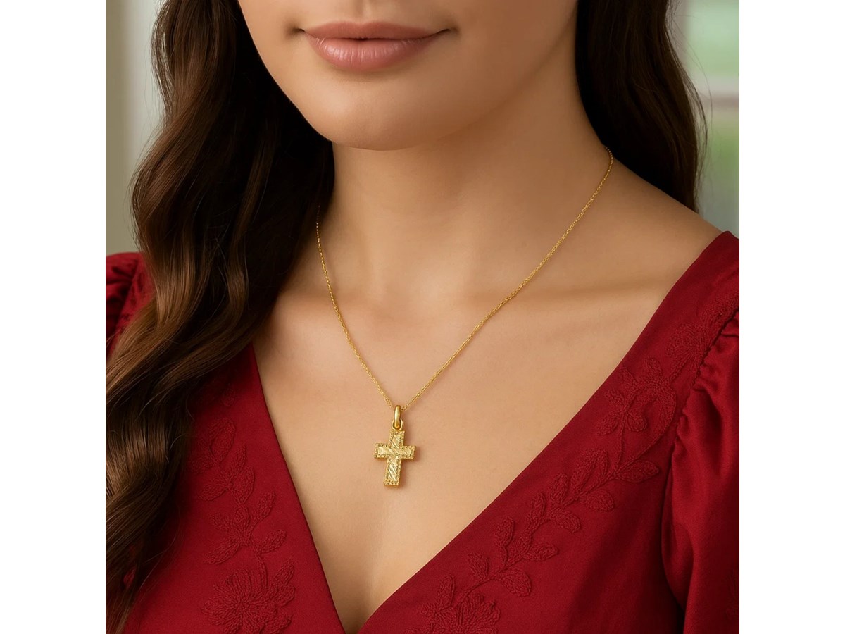 Embrace your faith with this exquisite 14K yellow gold necklace, featuring a beautifully textured cross pendant with diamond-cut and polished finishes. The 18 inches cable chain is secured with a spring ring clasp, ensuring both elegance and durability. This timeless piece adds a touch of sophistication to any ensemble, making it perfect for daily wear or special occasions. Expertly crafted, this necklace is a meaningful addition to your jewelry collection.