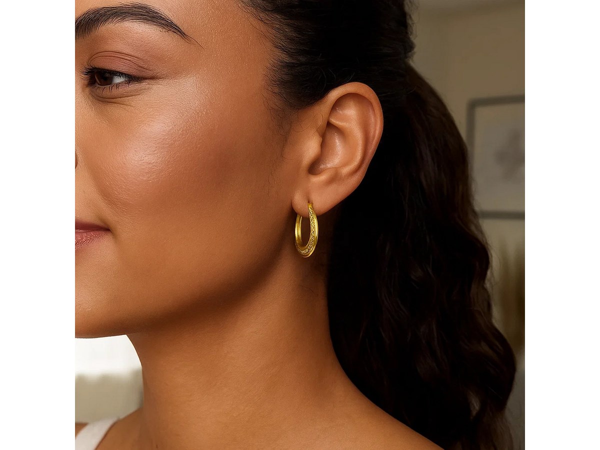14K Yellow Gold Diamond Cut Etched Pattern Hoop Earrings