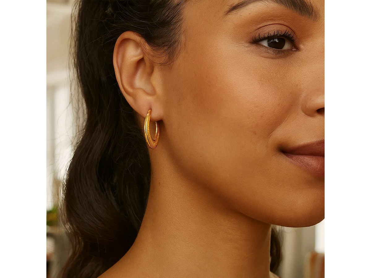 Stunning 14K yellow gold diamond-cut hoop earrings featuring an intricate etched pattern and polished finish. The detailed diamond-cut texture catches the light beautifully, adding sparkle and sophistication—perfect for elevating both everyday and evening looks.