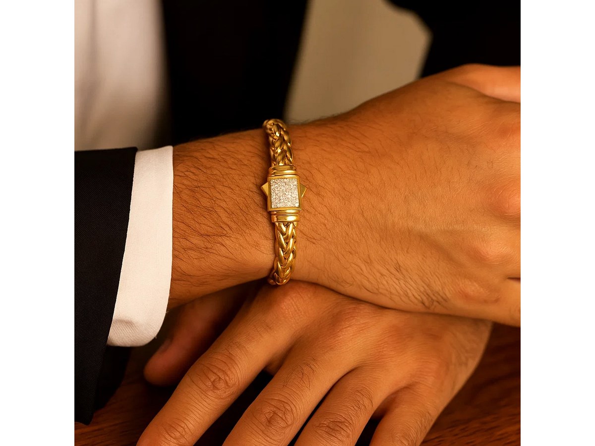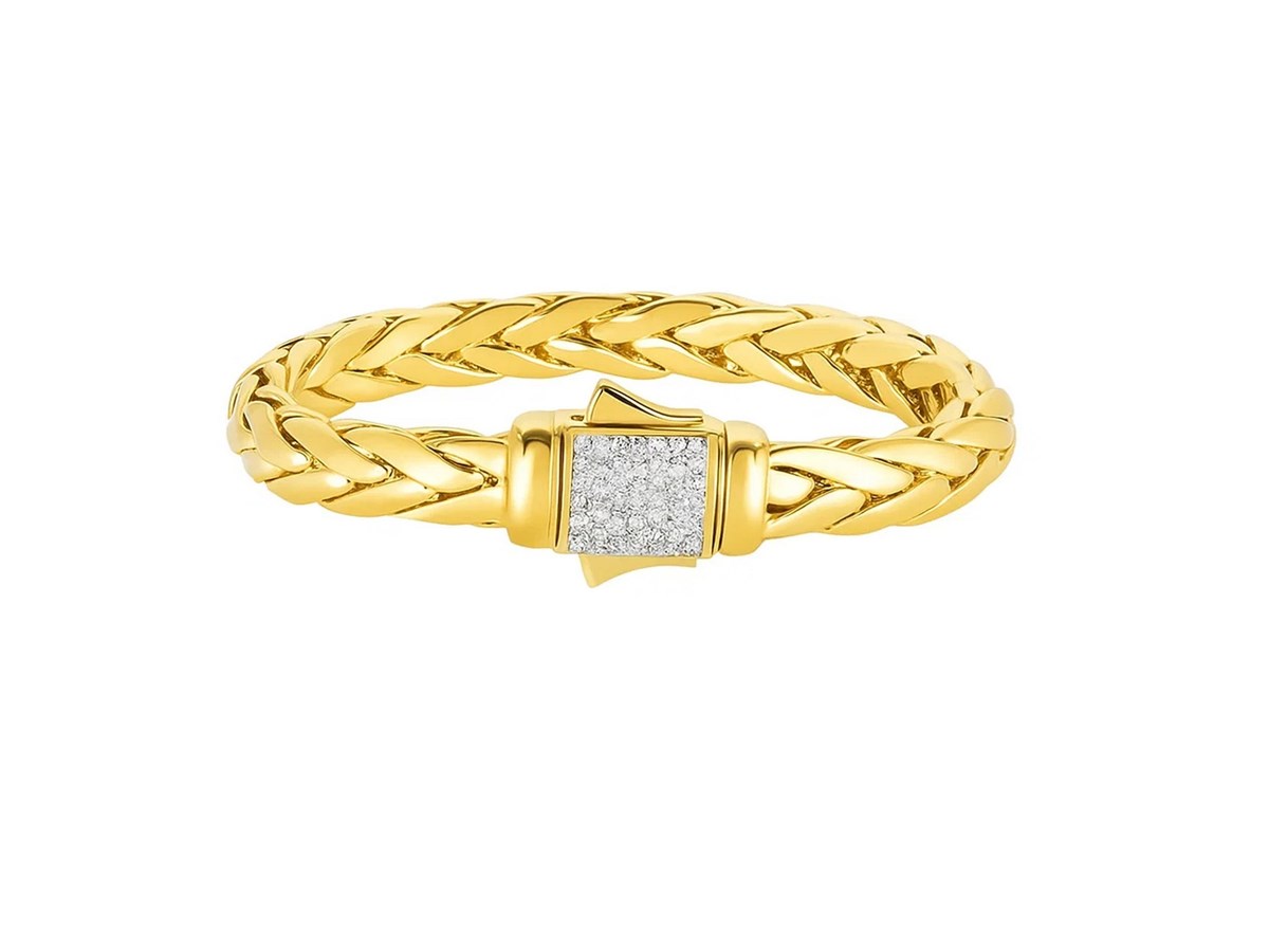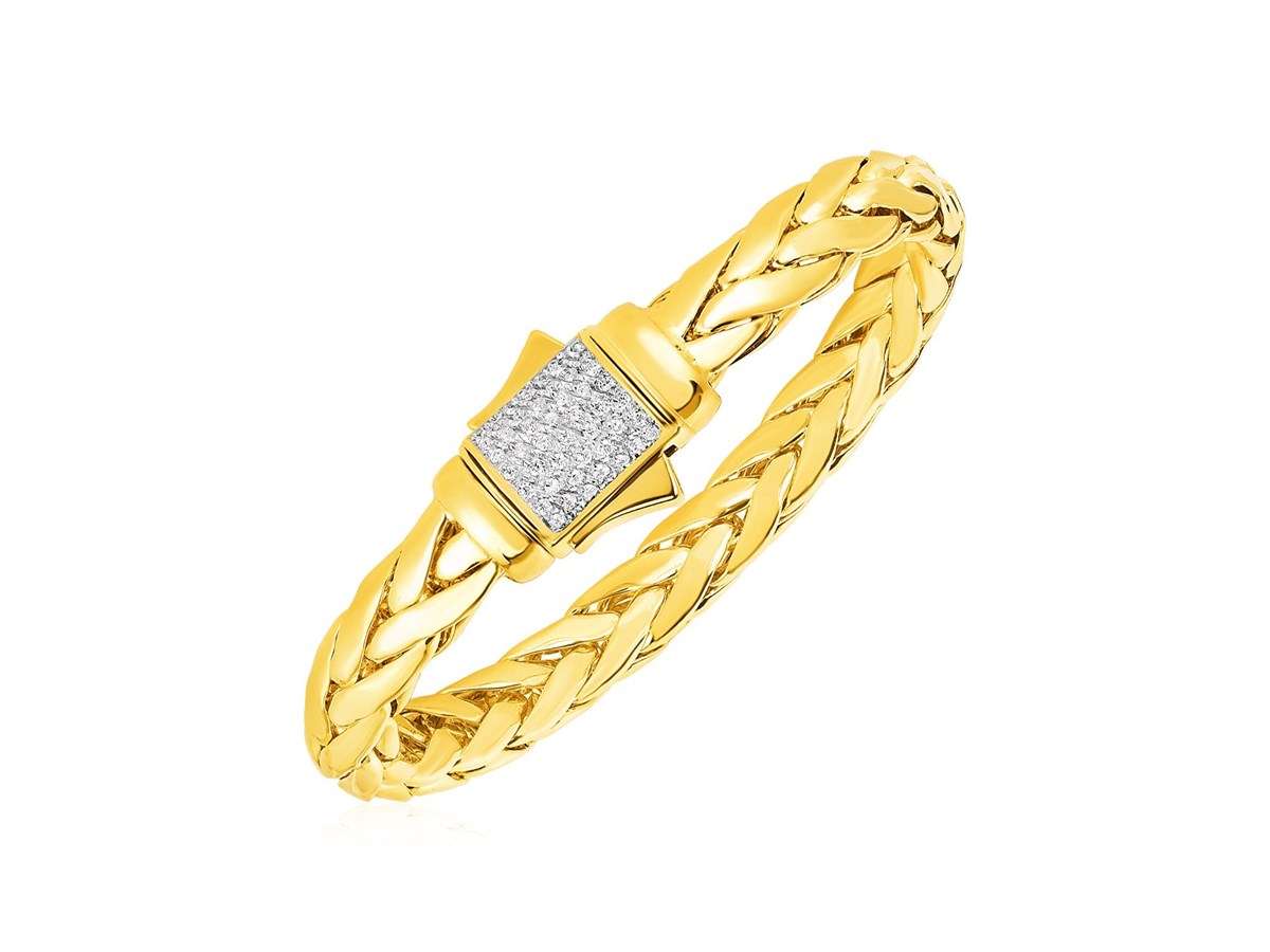 Luxurious 14K yellow gold woven bracelet featuring a polished finish and a diamond-accented box clasp. The intricate rope design exudes timeless elegance, while the sparkling diamonds and secure clasp add a touch of sophistication and brilliance.