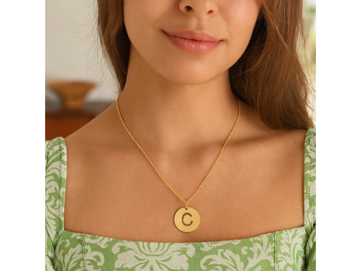 Shining in rich 14K yellow gold, this polished disc pendant features a delicately engraved Initial “C,” offering a personal touch with timeless appeal. Its minimalist design makes it ideal for everyday wear, thoughtful gifting, or effortless layering. Simple, stylish, and beautifully meaningful.