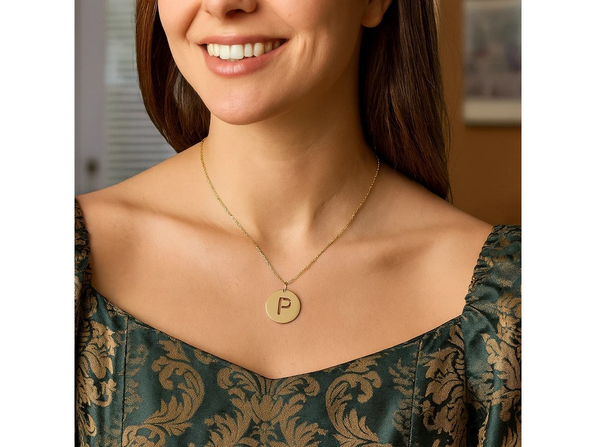 Shining in rich 14K yellow gold, this elegant disc pendant features a finely engraved Initial “P,” offering a timeless, personal touch. Its minimalist, polished design makes it perfect for everyday wear, thoughtful gifting, or effortless layering. Simple, chic, and beautifully meaningful.