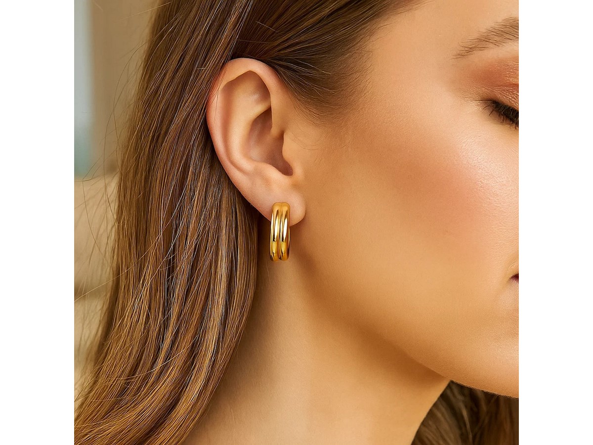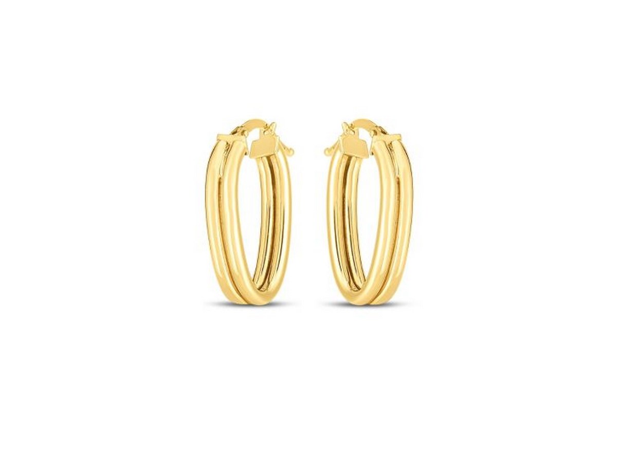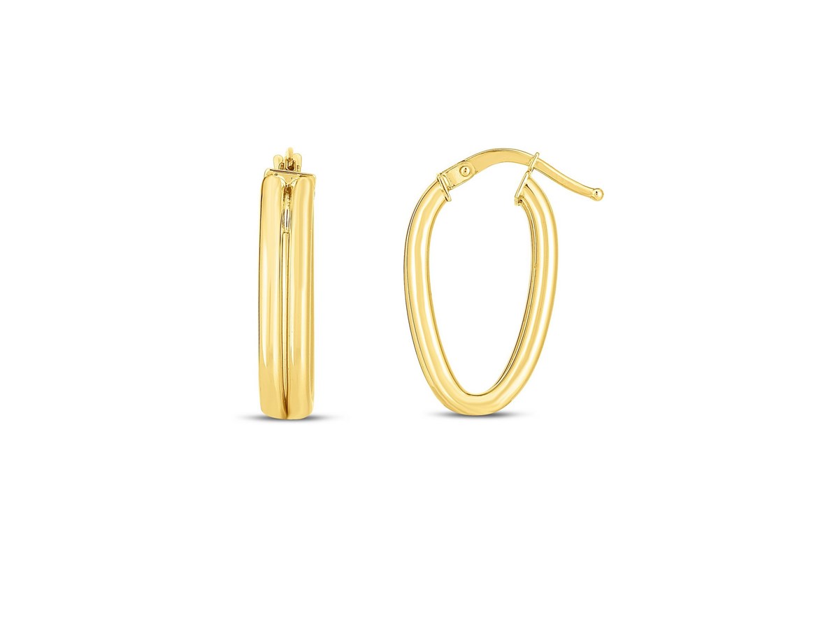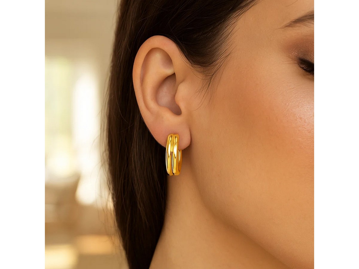 Elegant 14K yellow gold double oval hoop earrings featuring a polished interlocking design. The overlapping oval shapes create a graceful layered effect, adding depth and sophistication. Perfect for both everyday elegance and refined evening wear.