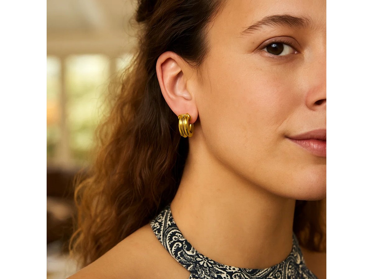 Elegant 14K yellow gold double row round hoop earrings measuring 8.00 mm. The polished double-row design enhances shine and dimension, creating a timeless statement piece that adds sophistication and versatility to any look.