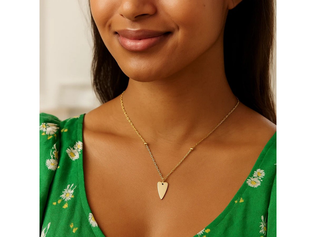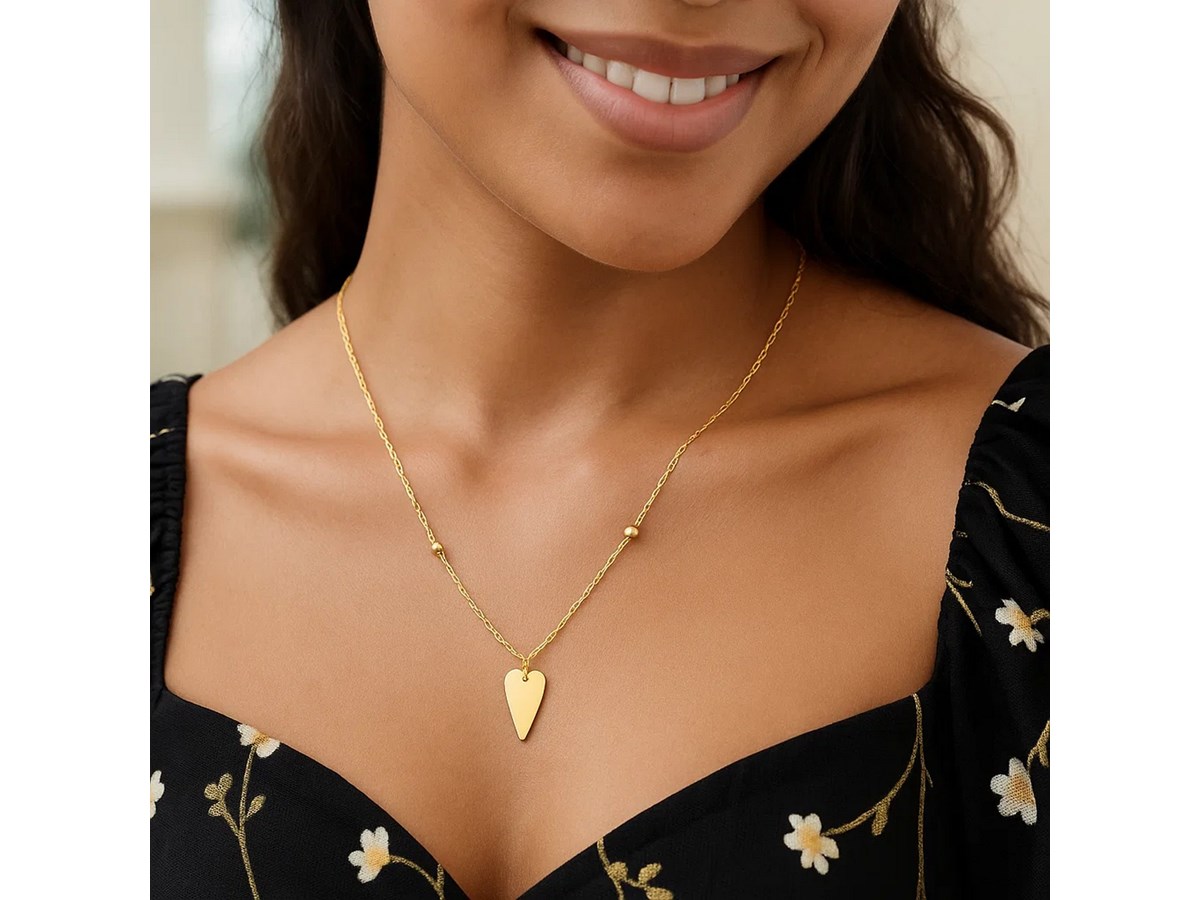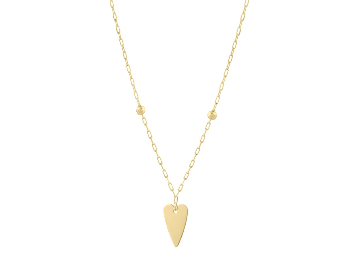 This 14K yellow gold elongated heart and bead station necklace features sleek heart accents paired with polished bead stations along a delicate chain. Its warm shine and modern romantic design make it perfect for everyday wear, layering, or gifting.
