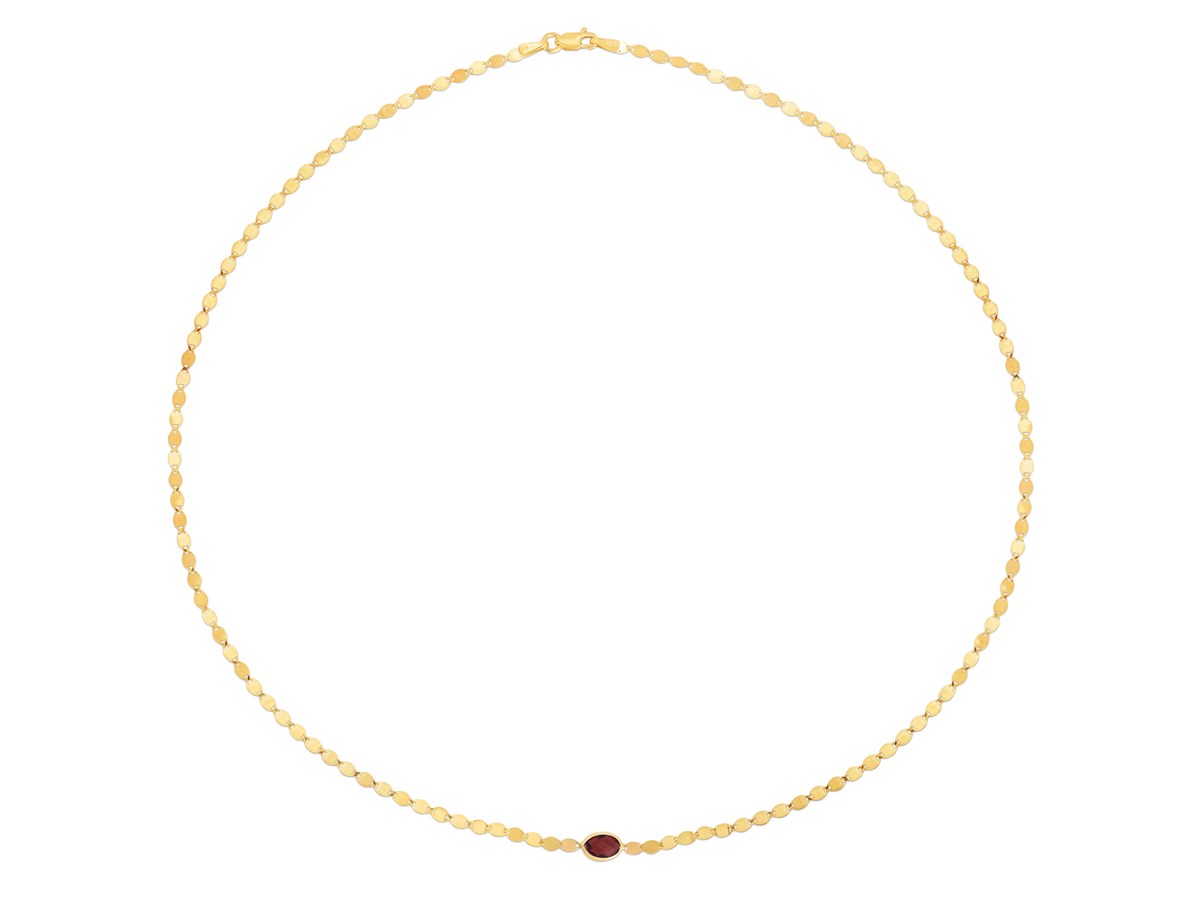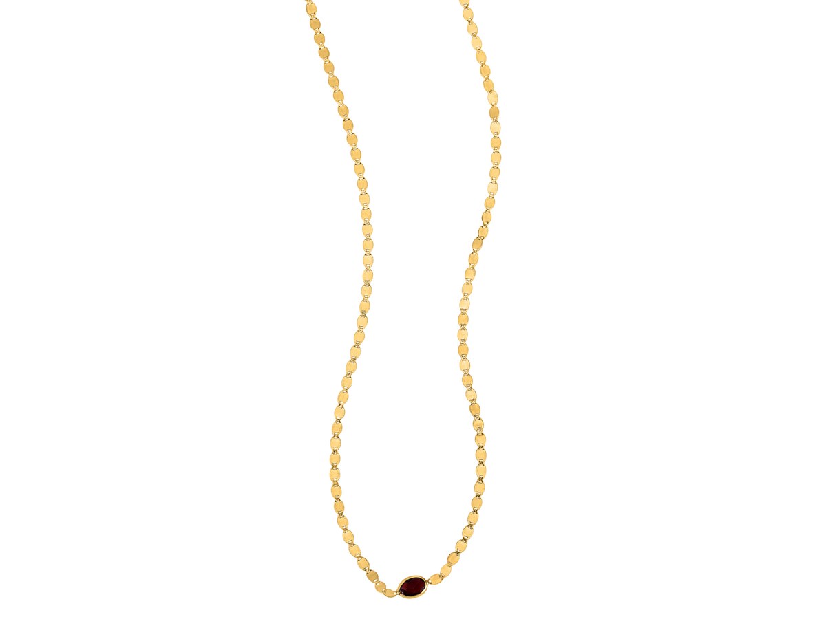Crafted in lustrous 14K yellow gold, this elegant mirrored chain necklace features a vivid 6×40 mm oval Garnet center, adding a touch of regal color. The sleek 2.20 mm mirrored chain beautifully reflects light, creating a subtle shimmer with every movement. Measuring 16 inches in length and finished with a secure lobster clasp, this piece merges timeless craftsmanship with wearable glamour.