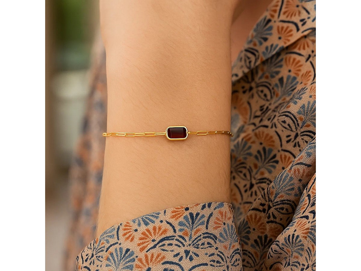 Crafted in solid 14K yellow gold, this stylish paperclip chain bracelet features a vibrant garnet gemstone that adds a warm, golden glow to your look. Measuring 7 inches in length, it is secured with a sturdy lobster clasp for comfortable, all day wear. Perfect for layering or as a stand alone statement piece.
