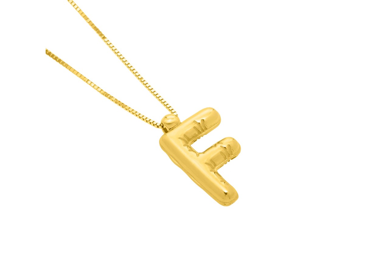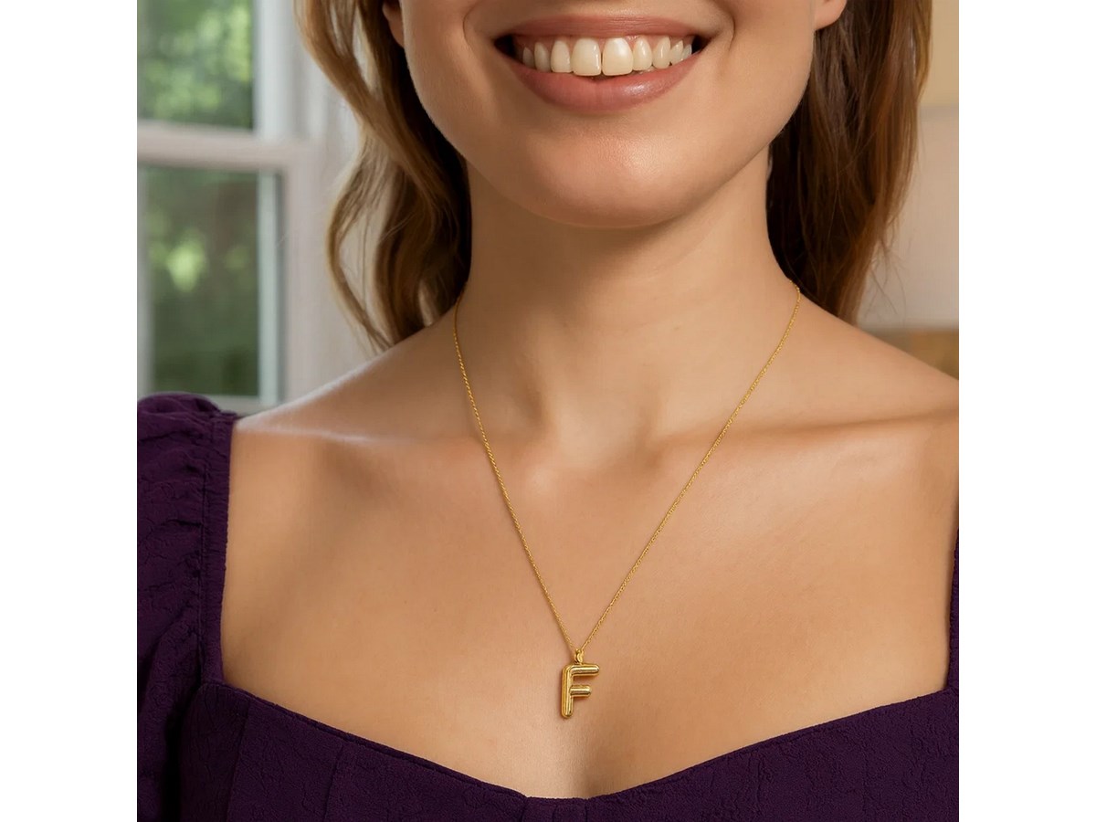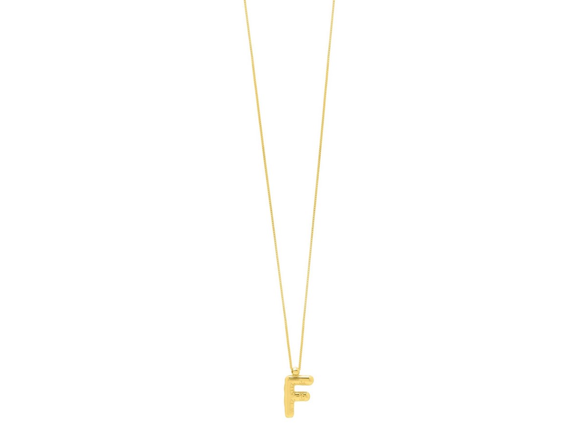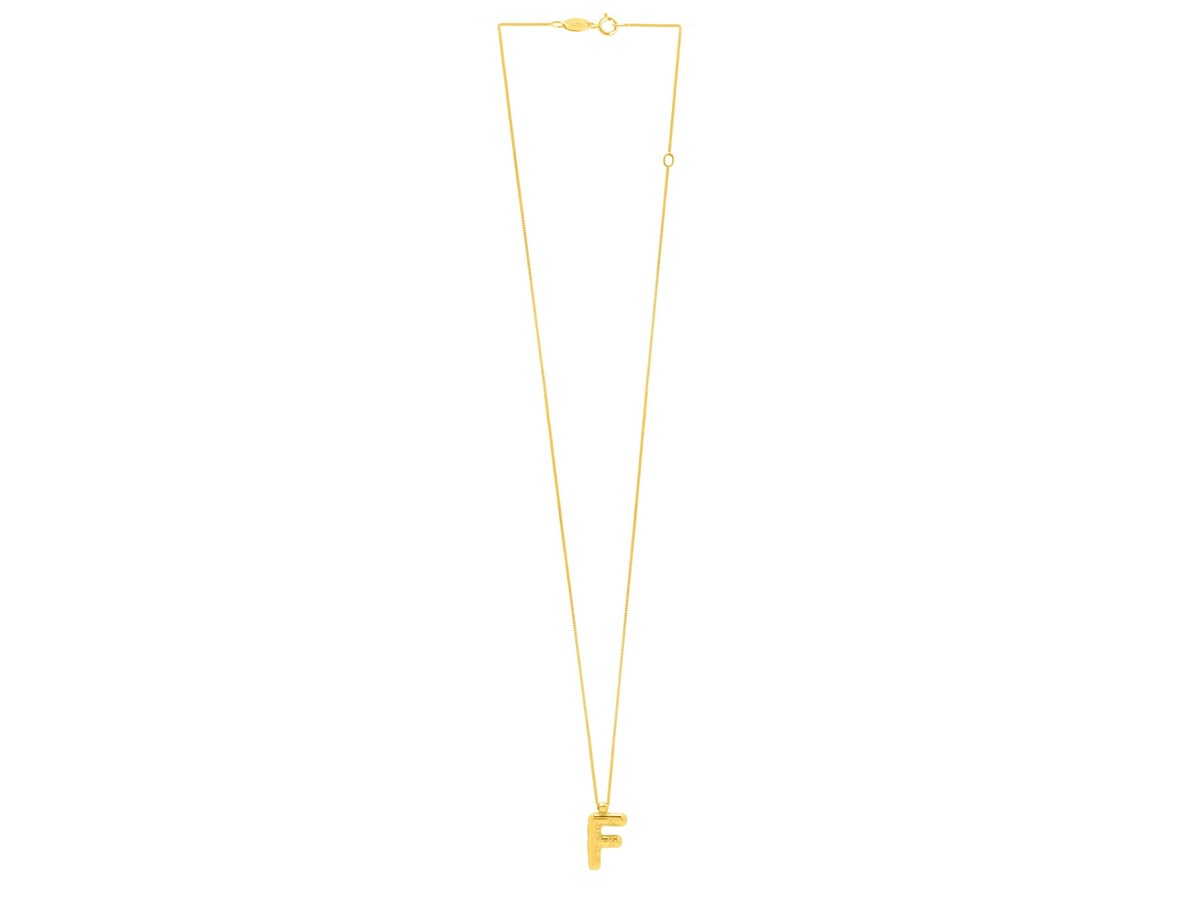 A lightweight 14K yellow gold initial F pendant featuring a sleek, airy design. Perfect for everyday wear or layering, it brings a simple, personalized touch to any jewelry collection.