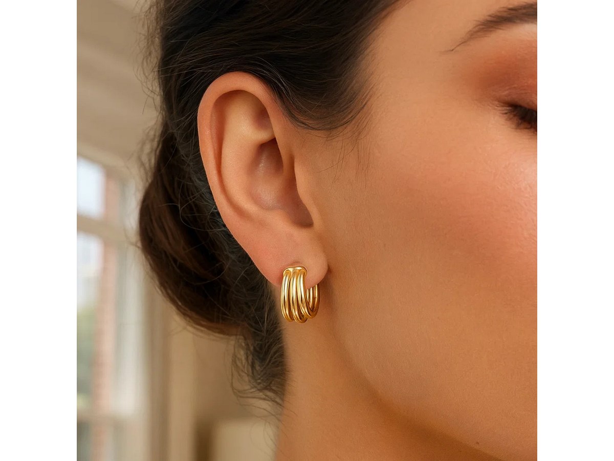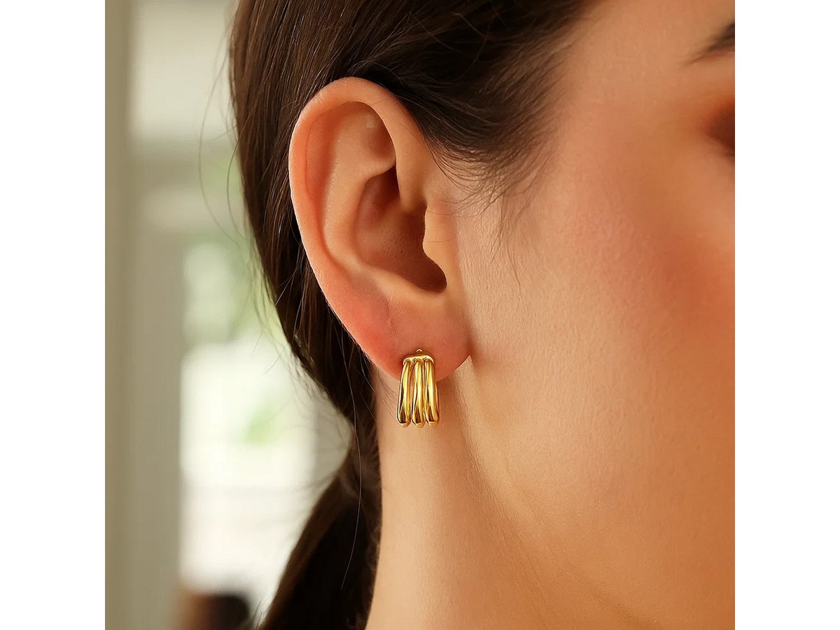 Elegant 14K yellow gold large triple row hoop earrings measuring 15.00 mm. Featuring a polished triple-band design that adds depth and brilliance, these timeless hoops offer bold sophistication and versatile style for both everyday wear and special occasions.