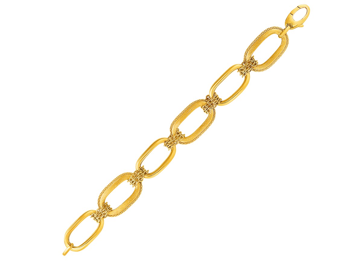 Wide gold diamond cut textured links alternate with delicate strands of cable chain. Bracelet is 7 1/2 inches long and closes with a lobster clasp.