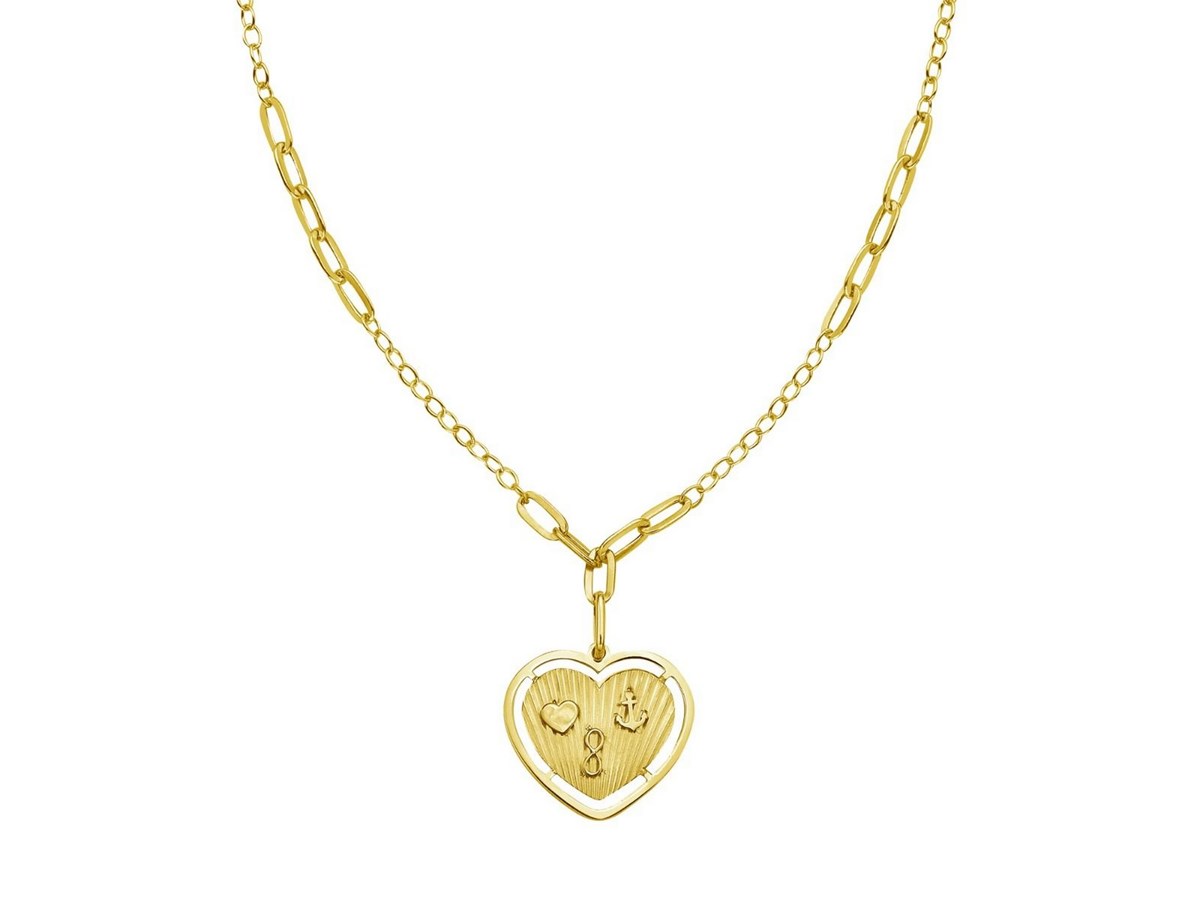 Introducing our 14K Yellow Gold Lucky Forever Heart Necklace, a harmonious blend of elegance and symbolism. This exquisite piece features a polished and textured heart pendant adorned with lucky symbols, representing eternal fortune and love. The pendant is gracefully suspended from a delicate link chain, secured with a spring ring clasp for reliable wear. Measuring 18 inches in length, this necklace sits beautifully on the neckline, making it a perfect accessory for any occasion. Elevate your jewelry collection with this meaningful and stylish piece, ideal for personal wear or as a heartfelt gift.