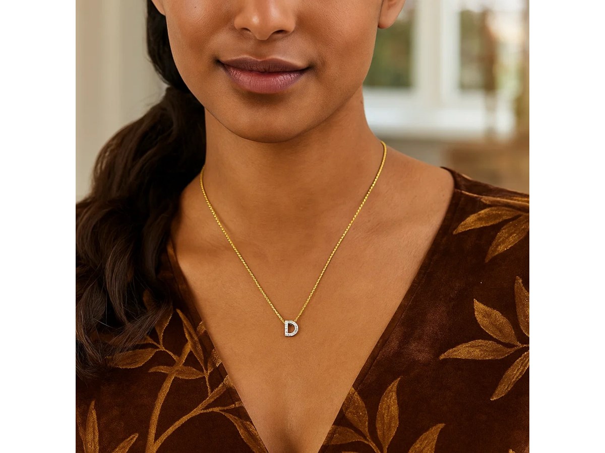 Celebrate individuality with this 14K yellow gold mini diamond D initial pendant. Adorned with sparkling round diamonds, this dainty yet elegant piece adds a personal touch to any look. Perfect for everyday wear or as a thoughtful gift, it comes with an 18 inches chain and a secure spring ring clasp for lasting beauty and comfort.