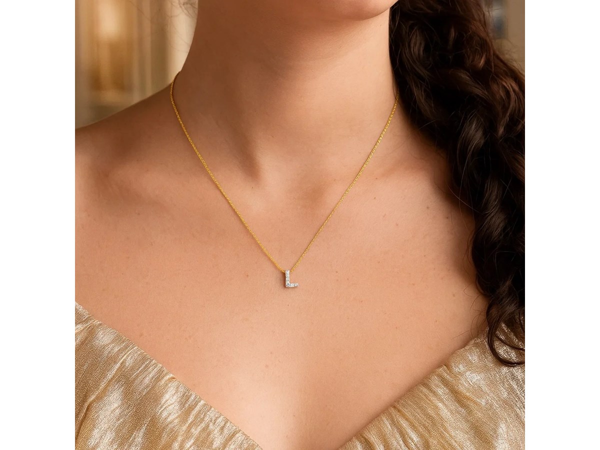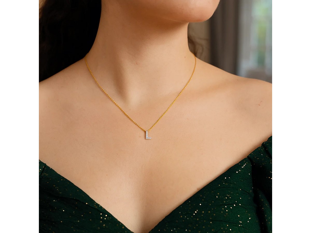 Celebrate individuality with this 14K yellow gold mini diamond L initial pendant. Adorned with sparkling round diamonds, this dainty yet elegant piece adds a personal touch to any look. Perfect for everyday wear or as a thoughtful gift, it comes with an 18 inches chain and a secure spring ring clasp for lasting beauty and comfort.