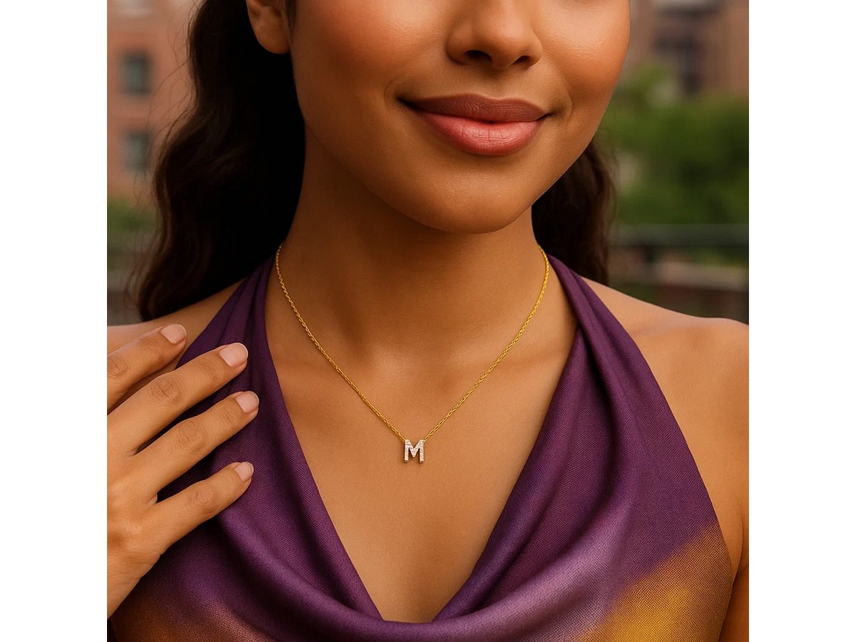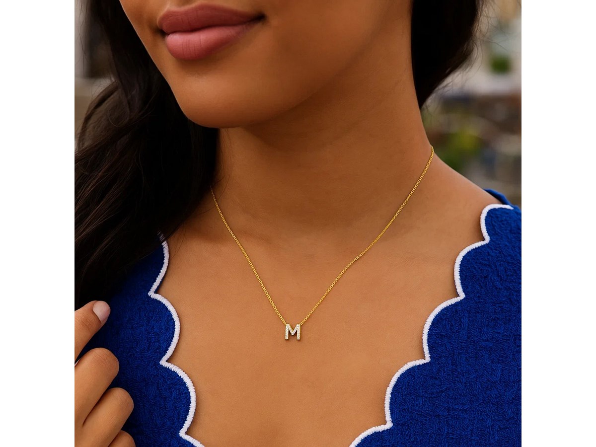 Celebrate individuality with this 14K yellow gold mini diamond M initial pendant. Adorned with sparkling round diamonds, this dainty yet elegant piece adds a personal touch to any look. Perfect for everyday wear or as a thoughtful gift, it comes with an 18 inches chain and a secure spring ring clasp for lasting beauty and comfort.