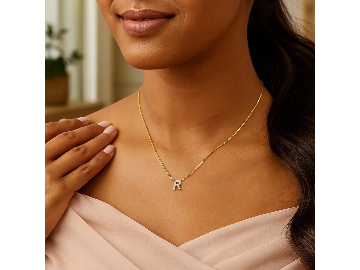 Celebrate individuality with this 14K yellow gold mini diamond R initial pendant. Adorned with sparkling round diamonds, this dainty yet elegant piece adds a personal touch to any look. Perfect for everyday wear or as a thoughtful gift, it comes with an 18 inches chain and a secure spring ring clasp for lasting beauty and comfort.