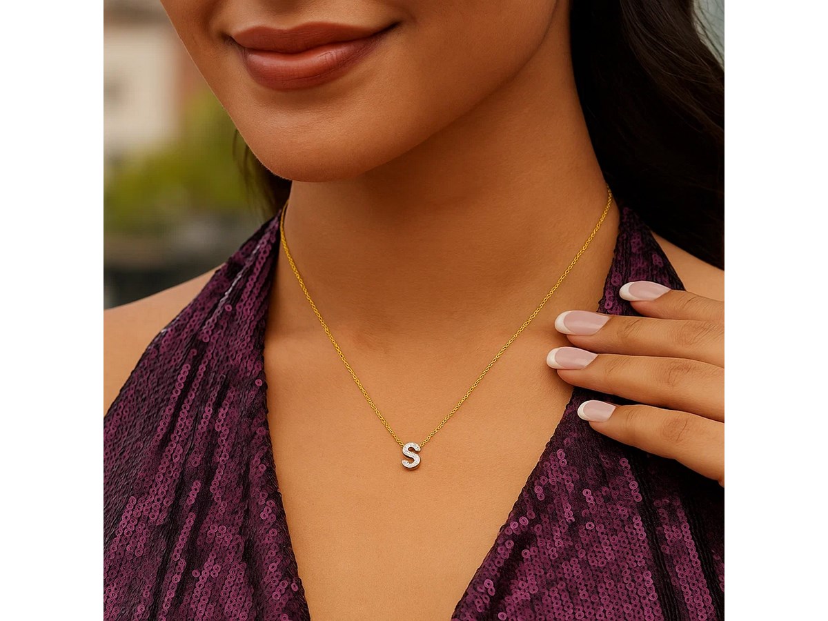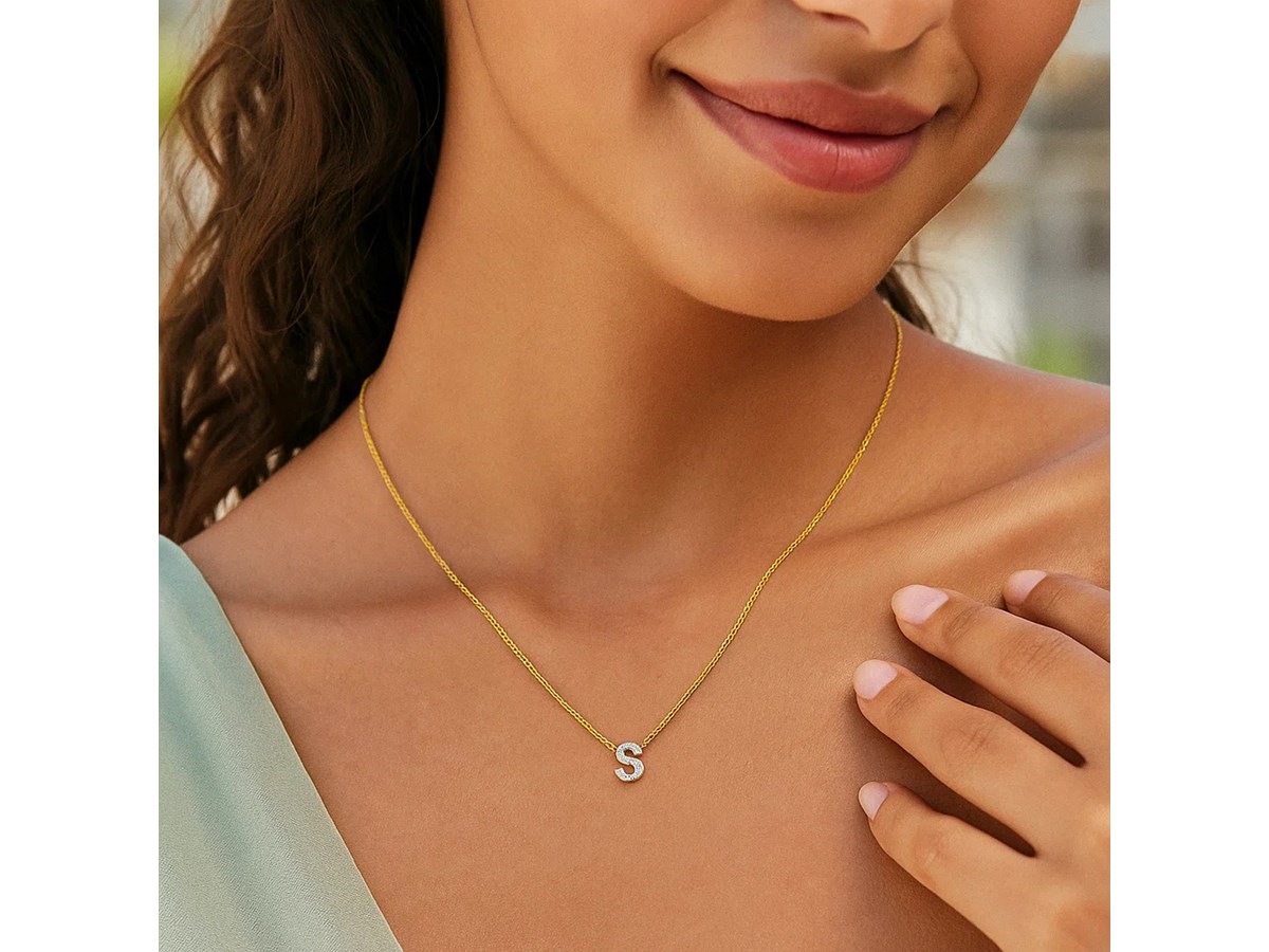 Celebrate individuality with this 14K yellow gold mini diamond S initial pendant. Adorned with sparkling round diamonds, this dainty yet elegant piece adds a personal touch to any look. Perfect for everyday wear or as a thoughtful gift, it comes with an 18 inches chain and a secure spring ring clasp for lasting beauty and comfort.