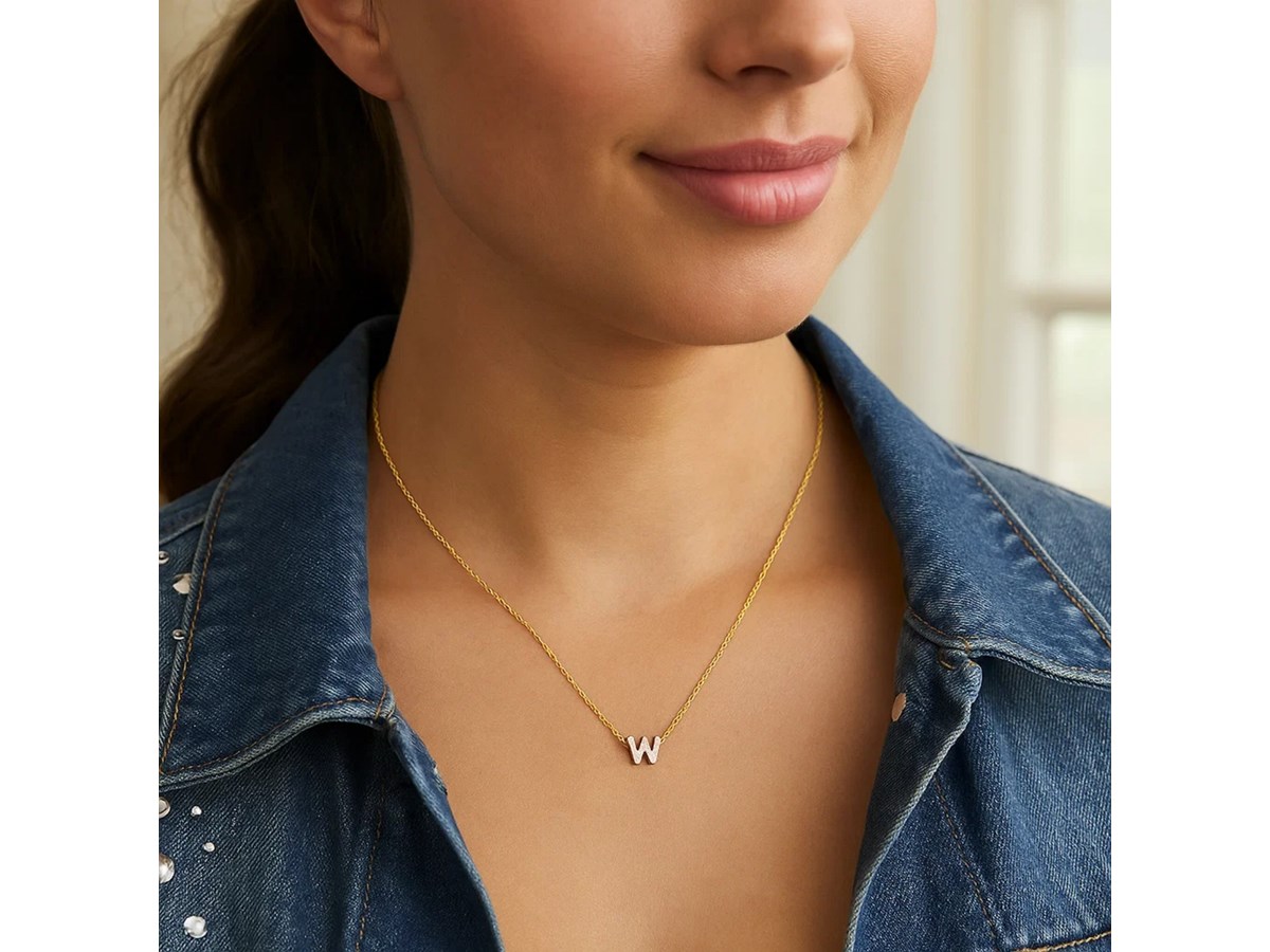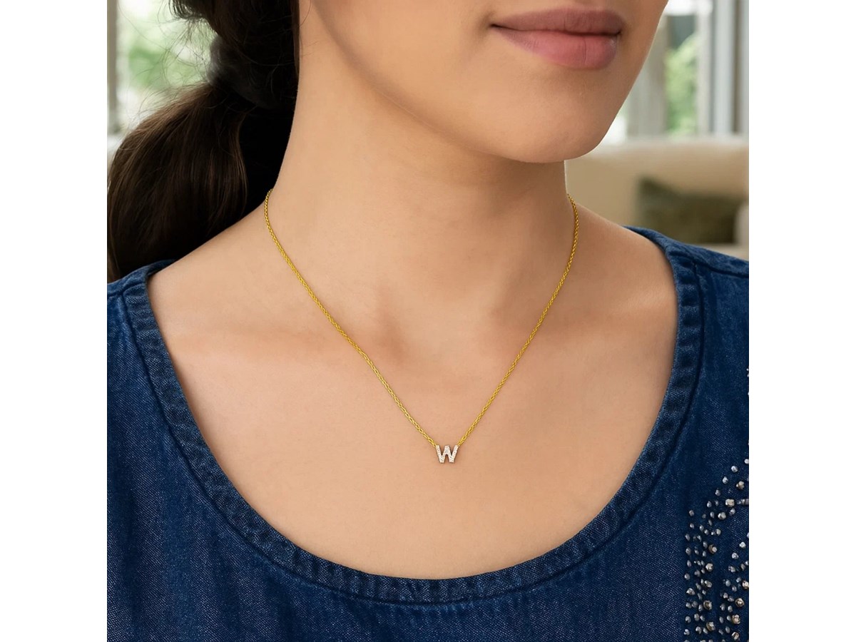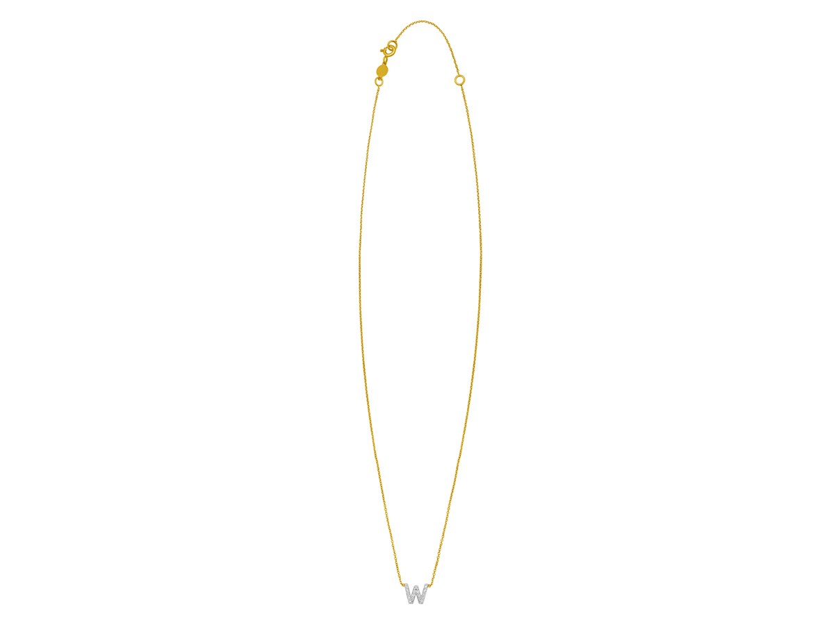 Celebrate individuality with this 14K yellow gold mini diamond W initial pendant. Adorned with sparkling round diamonds, this dainty yet elegant piece adds a personal touch to any look. Perfect for everyday wear or as a thoughtful gift, it comes with an 18 inches chain and a secure spring ring clasp for lasting beauty and comfort.