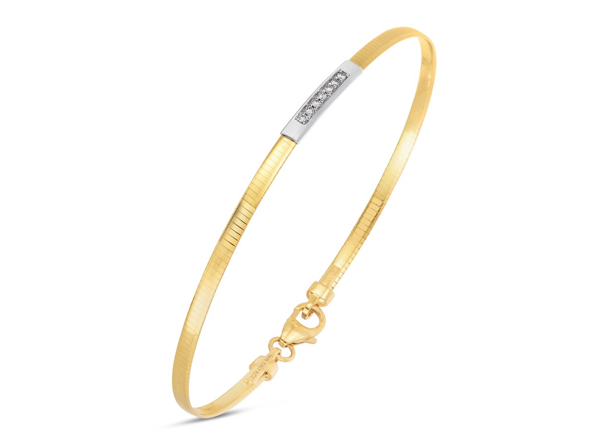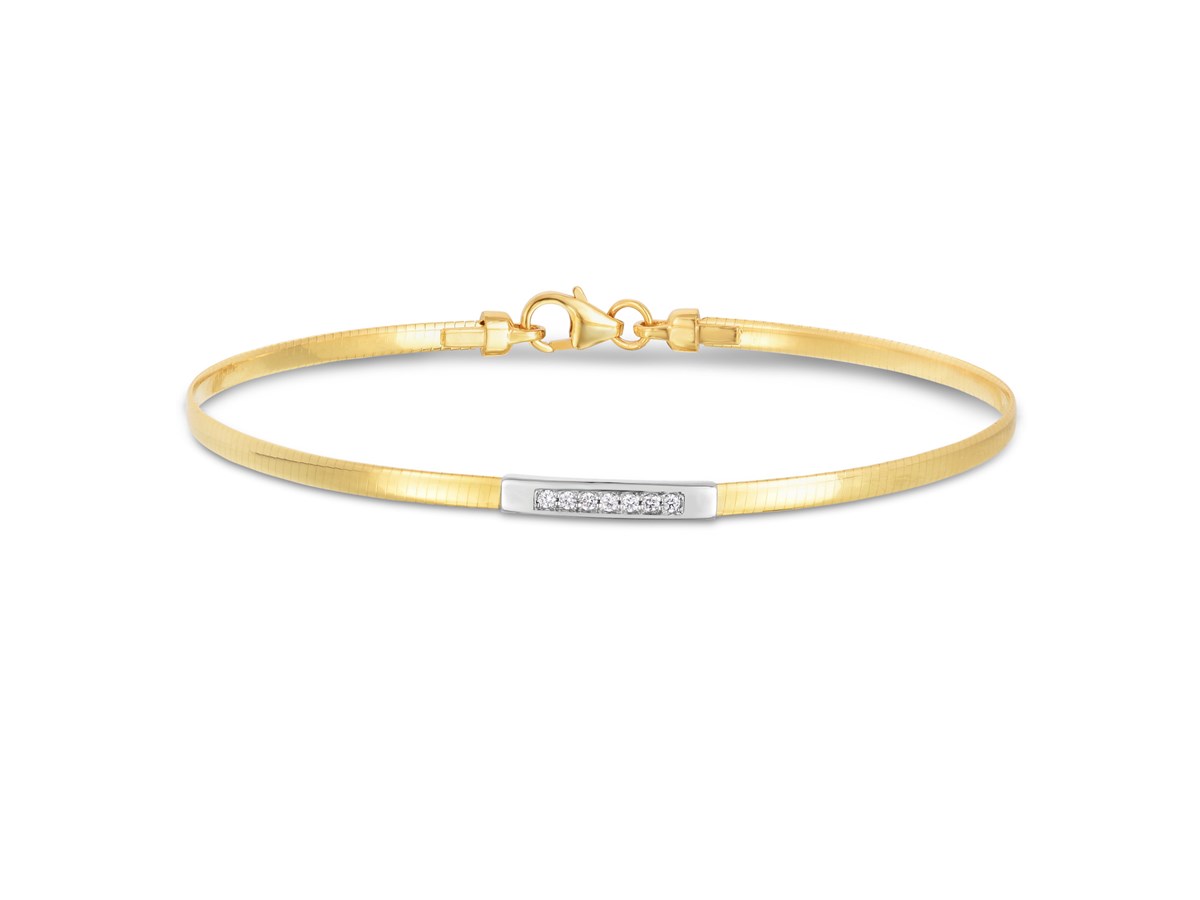 Elevate your style with this 14K yellow gold skinny omega bracelet, featuring a sparkling diamond bar 0.06 cttw. Measuring 7 inches in length, this elegant piece is secured with a durable lobster clasp, making it perfect for everyday wear or special occasions.