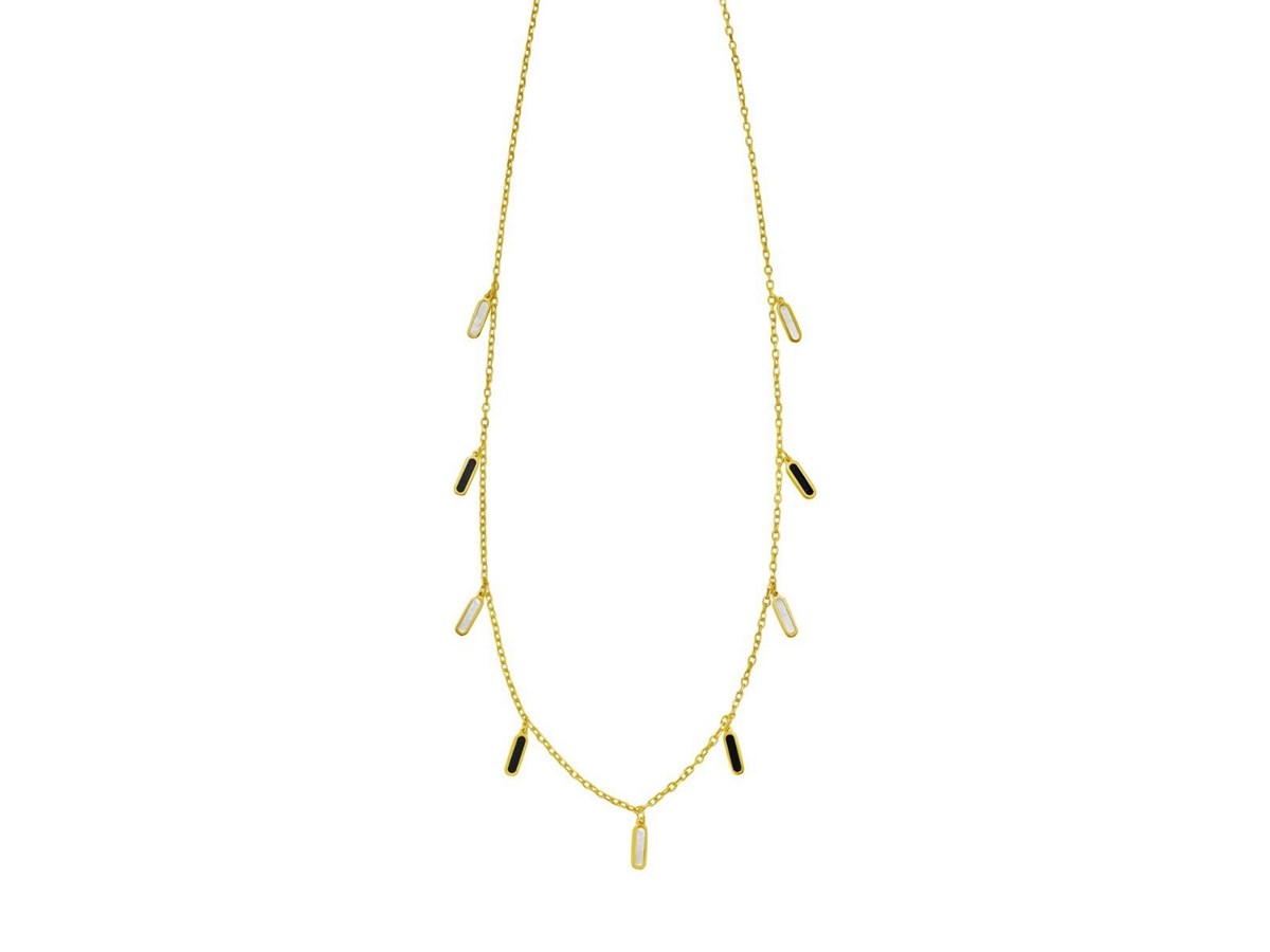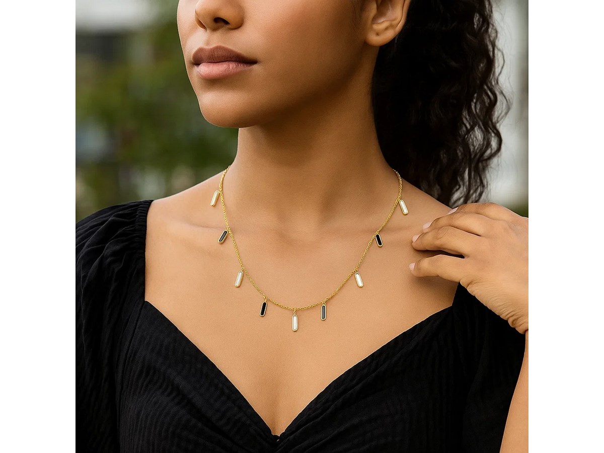 Enhance your jewelry collection with this elegant 18 inches 14K yellow gold station necklace, artfully inlaid with alternating rich onyx and lustrous mother-of-pearl accents. A refined piece designed to elevate any ensemble with natural beauty and polished sophistication secured with lobster clasp.