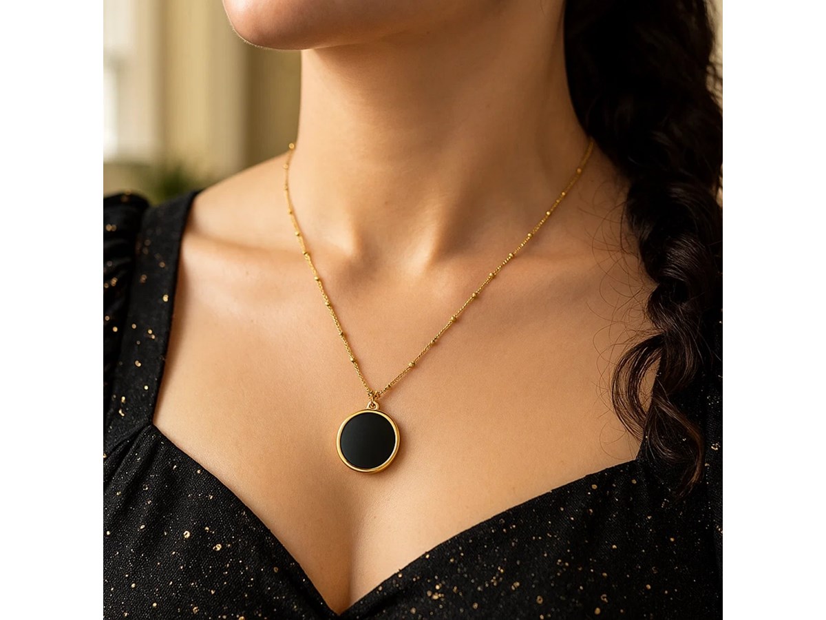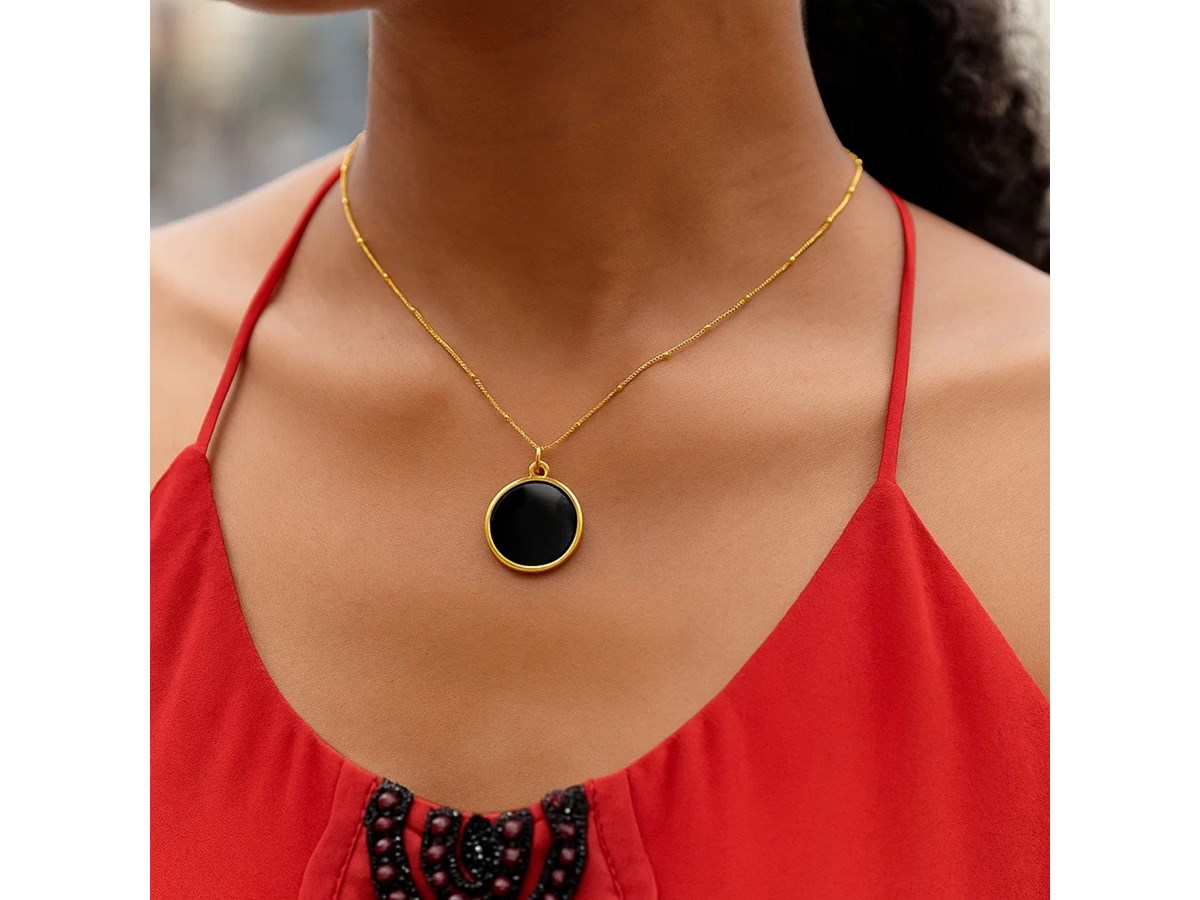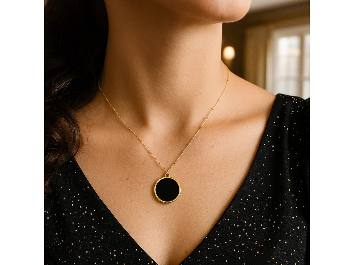 Elevate your elegance with this stunning 14K Yellow Gold Onyx Inlay Circle Necklace. Designed with modern minimalism in mind, the piece features a sleek circular pendant accented with a rich black onyx inlay—creating a bold contrast against the warm shine of 14K yellow gold. The pendant is gracefully suspended from an 18 inches chain, with a jump ring at 16 inches for versatile styling. The necklace is secured with a classic spring-ring clasp, offering both comfort and reliability for all-day wear.