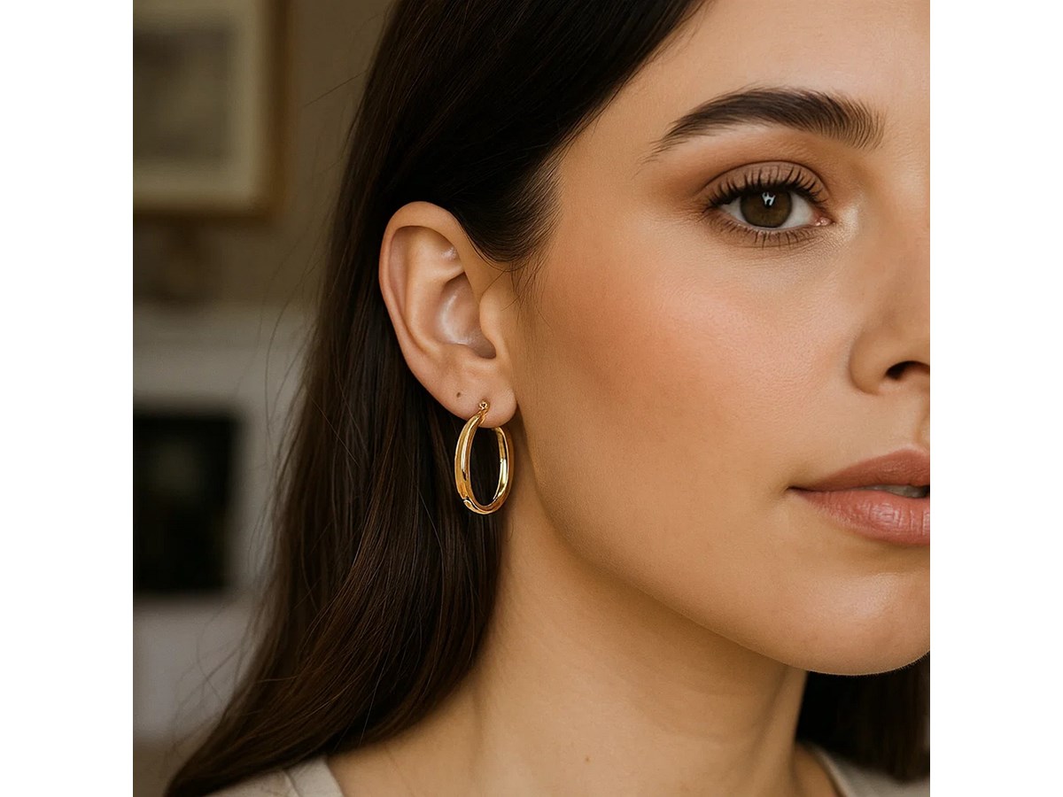 Elegant 14K yellow gold oval back-to-back hoop earrings featuring a polished finish and modern overlapping design. The oval shape adds a touch of sophistication and versatility, making these hoops perfect for both everyday wear and special occasions.