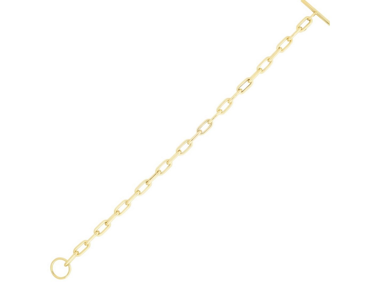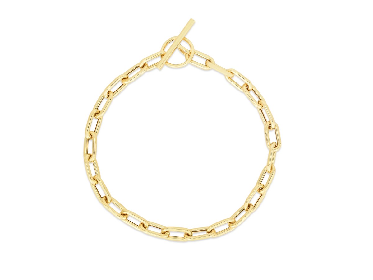 Crafted in radiant 14K yellow gold, this paperclip toggle bracelet features elongated, polished links paired with a bold front-facing toggle clasp for a modern, effortless look. Its sleek, minimalist design and warm golden shine make it a standout piece that transitions seamlessly from everyday wear to elevated styling, whether worn solo or layered with your favorite bracelets.