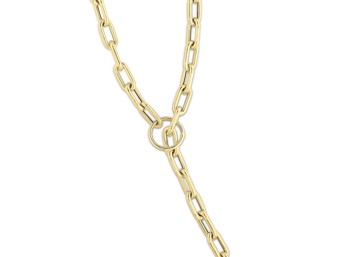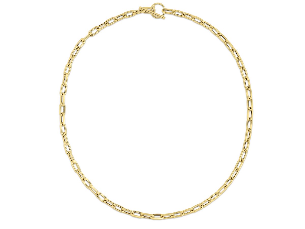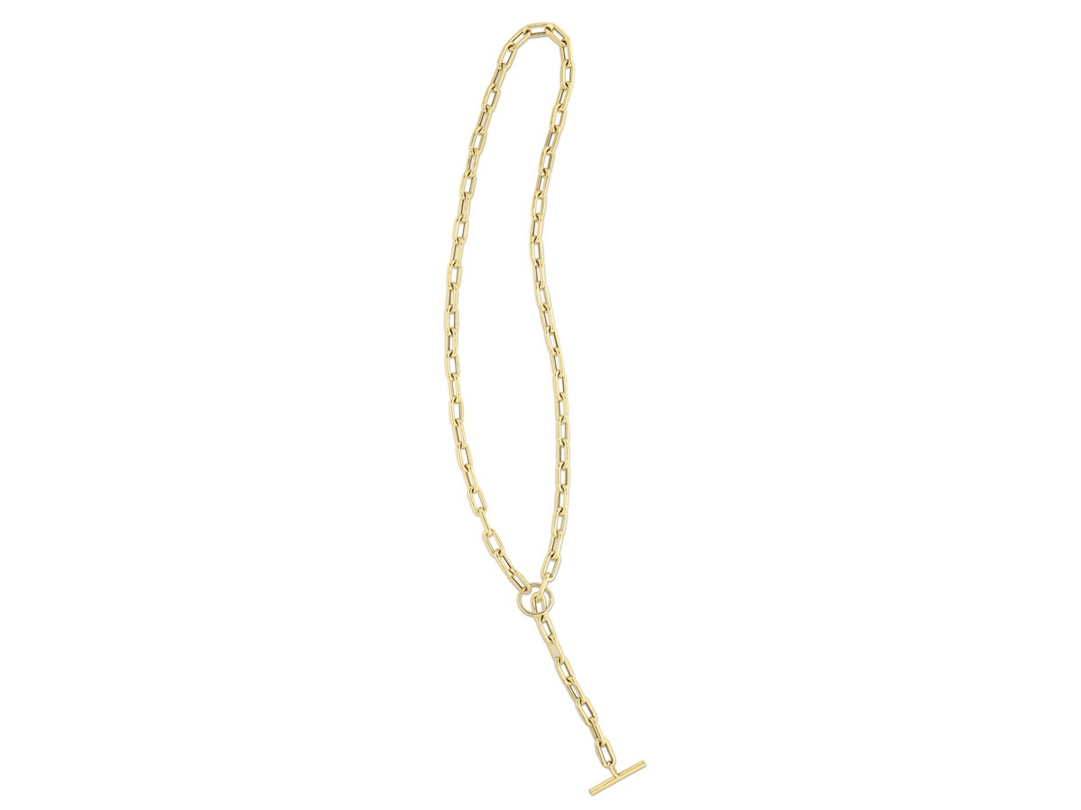 This 14K yellow gold paperclip toggle link necklace features bold, elongated links paired with a stylish front toggle clasp. Its warm shine and modern design make it a versatile statement piece perfect for everyday wear or layering with other gold favorites.