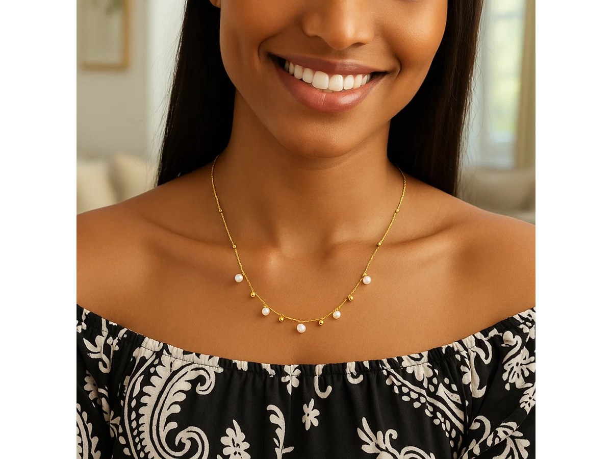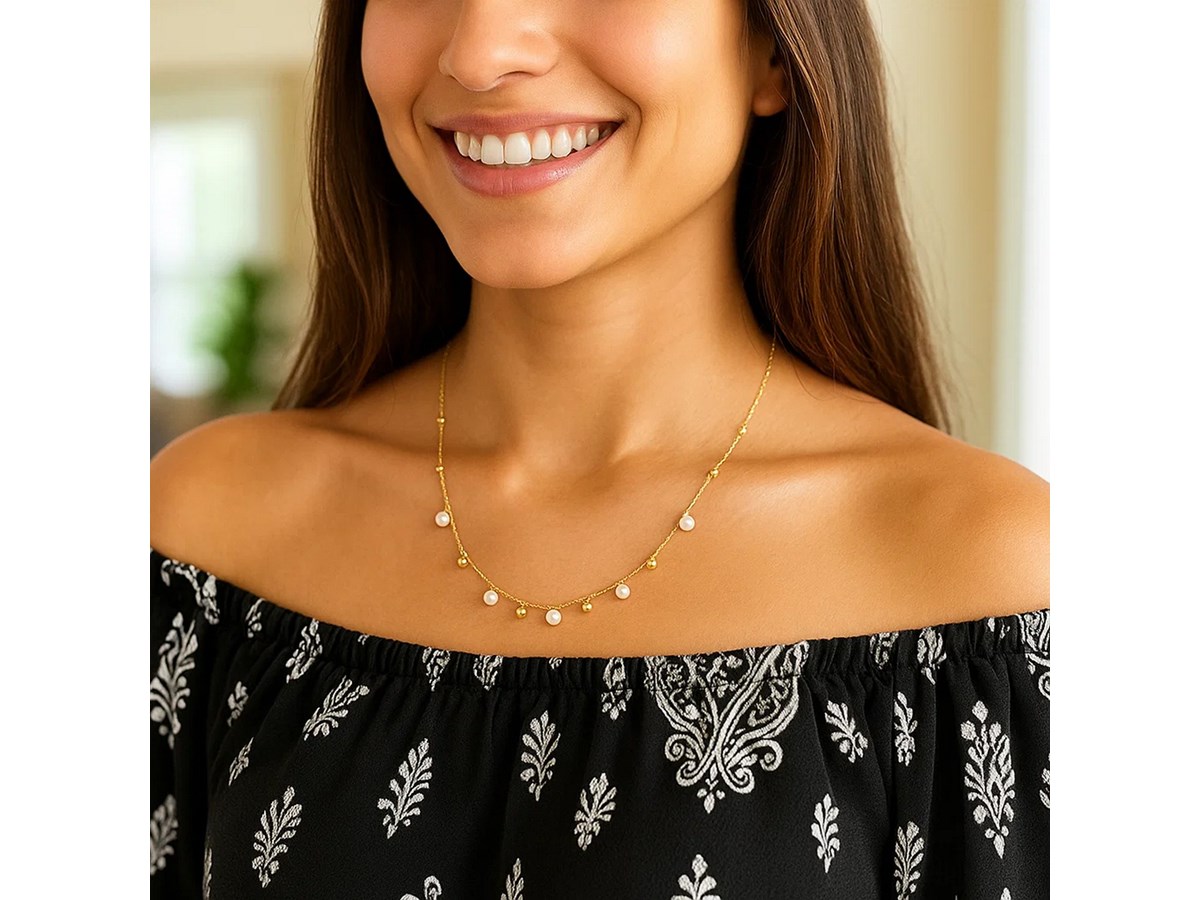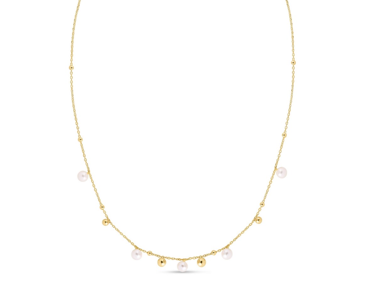 This 14K yellow gold pearl and scattered bead necklace features a lustrous pearl accented by polished gold beads along a delicate chain. Its elegant, timeless design adds a refined touch to everyday looks and makes a beautiful piece for layering or gifting.
