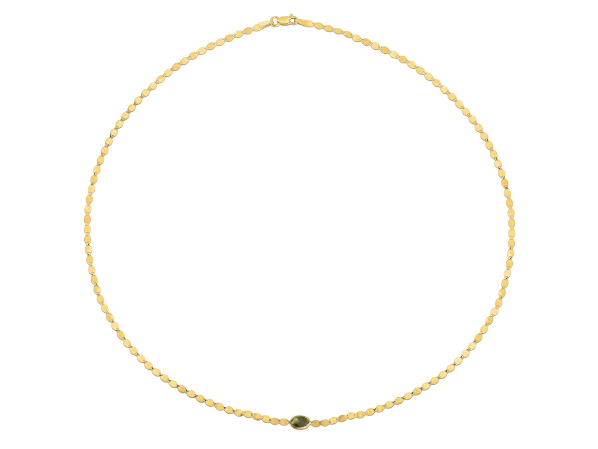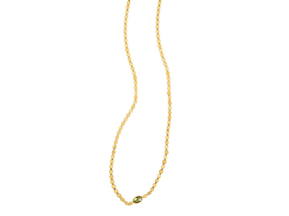 Crafted in lustrous 14K yellow gold, this elegant mirrored chain features a vivid 6×40 mm oval Peridot center, adding a touch of regal color. The sleek 2.20 mm mirrored chain beautifully reflects light, creating a subtle shimmer with every movement. Measuring 16 inches in length and finished with a secure lobster clasp, this piece merges timeless craftsmanship with wearable glamour