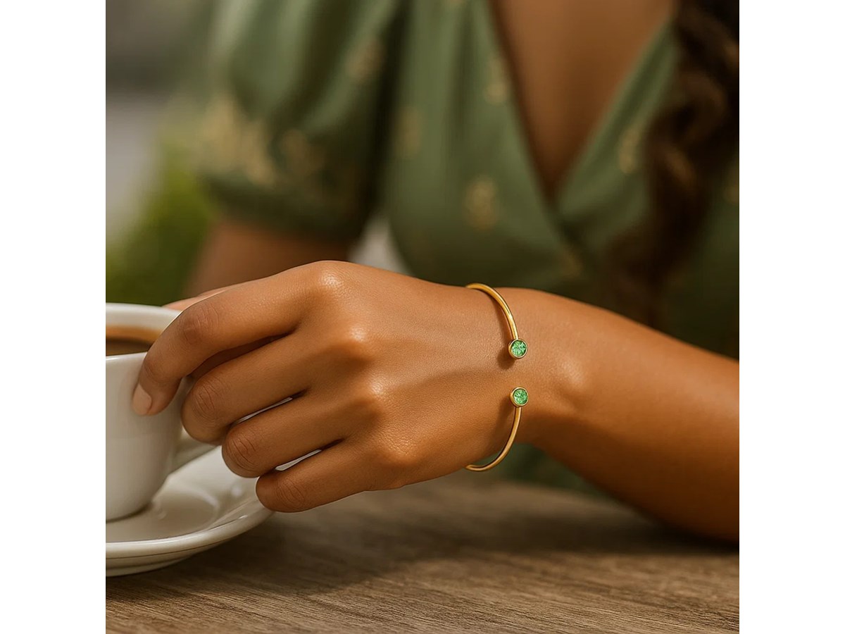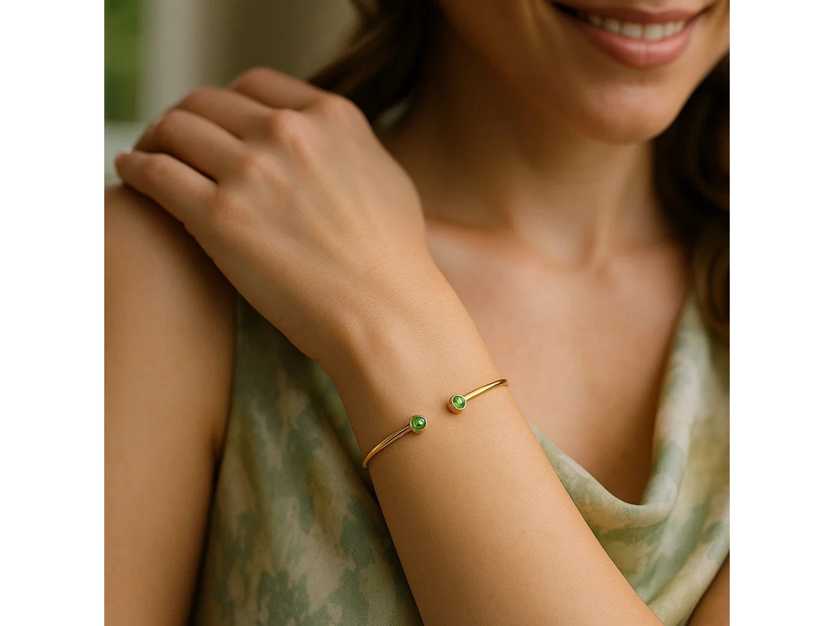 Make a bold yet elegant statement with our 14K Yellow Gold Peridot Open Cuff Bangle, featuring a slim, polished 2.00 mm round profile that exudes subtle sophistication. Crafted in lustrous 14K yellow gold, this cuff style bangle opens at the wrist for effortless wear and removal. At each end, it’s adorned with delicate 3.00 mm round Peridot. With its sleek finish and minimalistic design, this piece is versatile perfect for stacking, styling as a standalone statement, or layering with mixed metals for a contemporary look.