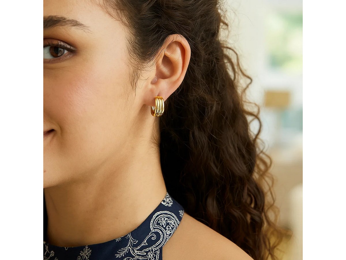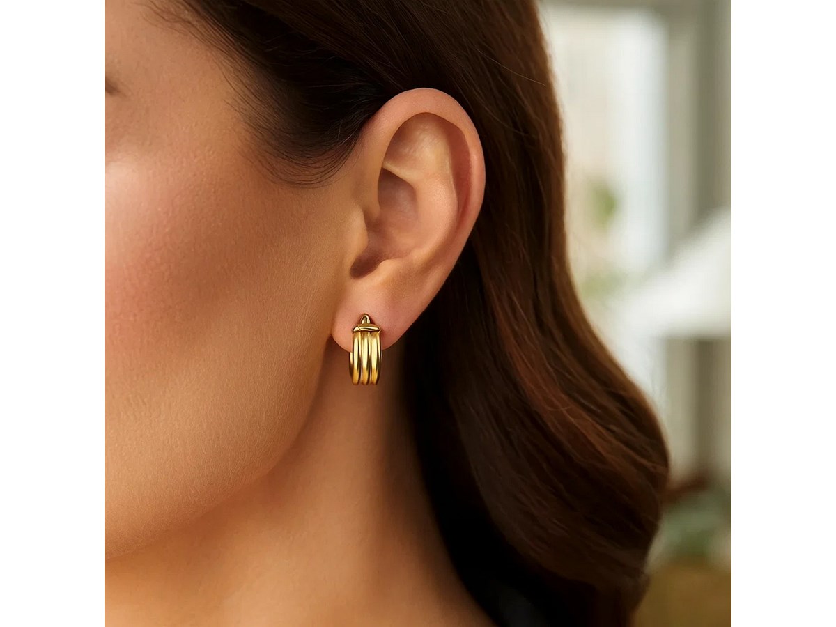 Chic 14K yellow gold small triple row round hoop earrings measuring 10.00 mm. Featuring a polished triple-row design for added depth and brilliance, these elegant hoops offer timeless style and versatility, perfect for both everyday wear and special occasions.