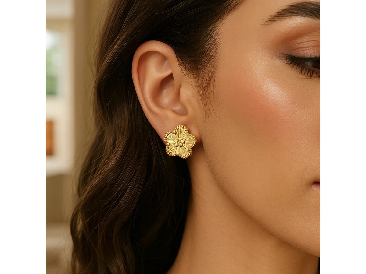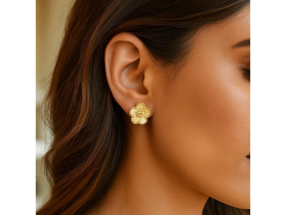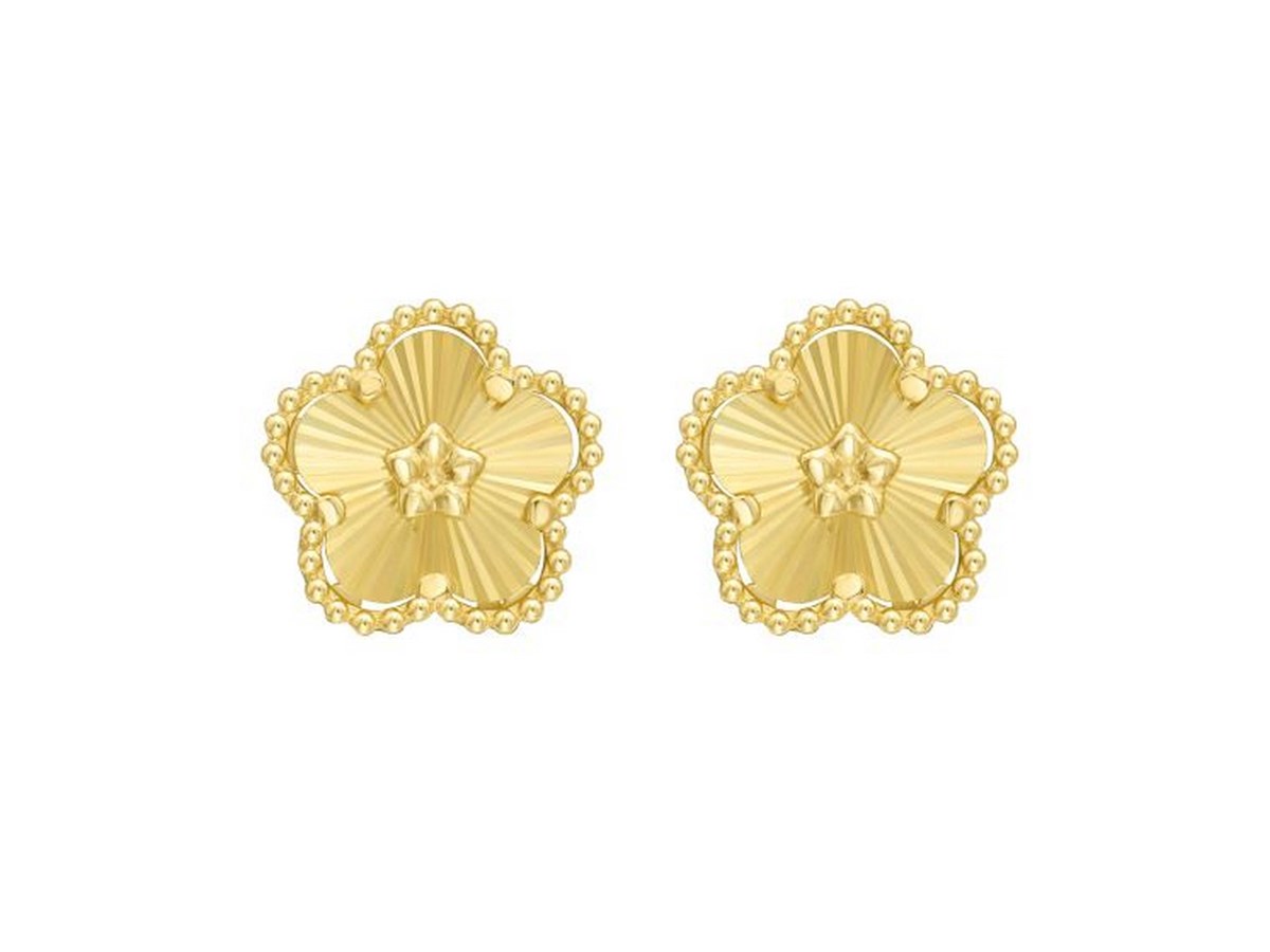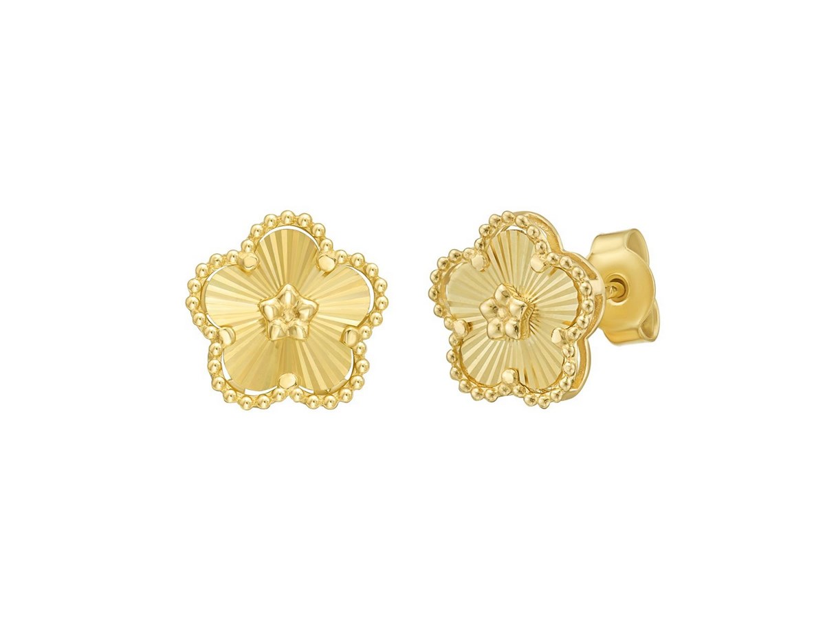 Charming 14K yellow gold textured daisy earrings featuring intricate petal detailing and a radiant polished finish. Their elegant floral design captures timeless beauty, adding a touch of sophistication and femininity to any look perfect for everyday wear or special occasions.