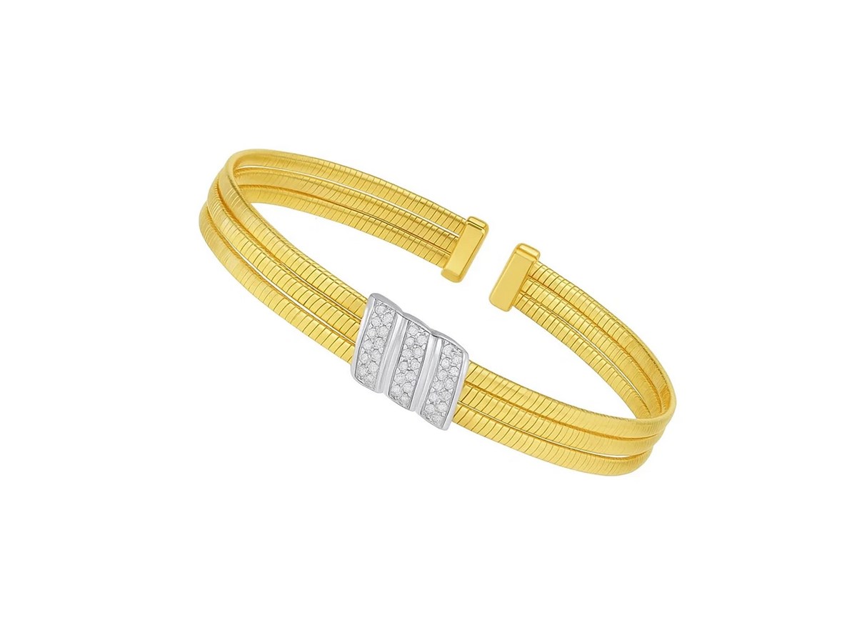 Elevate your elegance with this 14K yellow gold cuff bangle, featuring a stunning triple-row omega design adorned with .21 carats of sparkling diamonds. The polished finish enhances its luxurious appeal, making it a perfect accessory for both everyday wear and special occasions. Crafted with precision, this bangle offers a timeless addition to any jewelry collection.