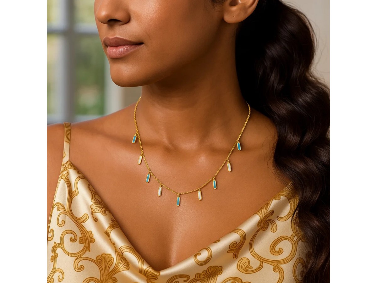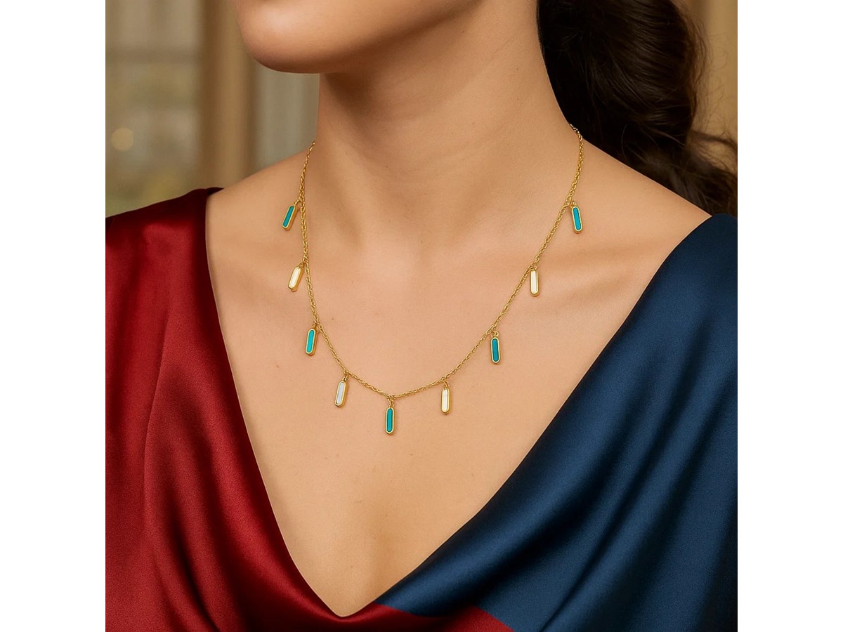 Enhance your jewelry collection with this elegant 18 inches 14K yellow gold station necklace, artfully inlaid with alternating rich turquoise and lustrous mother-of-pearl accents. A refined piece designed to elevate any ensemble with natural beauty and polished sophistication secured with lobster clasp.