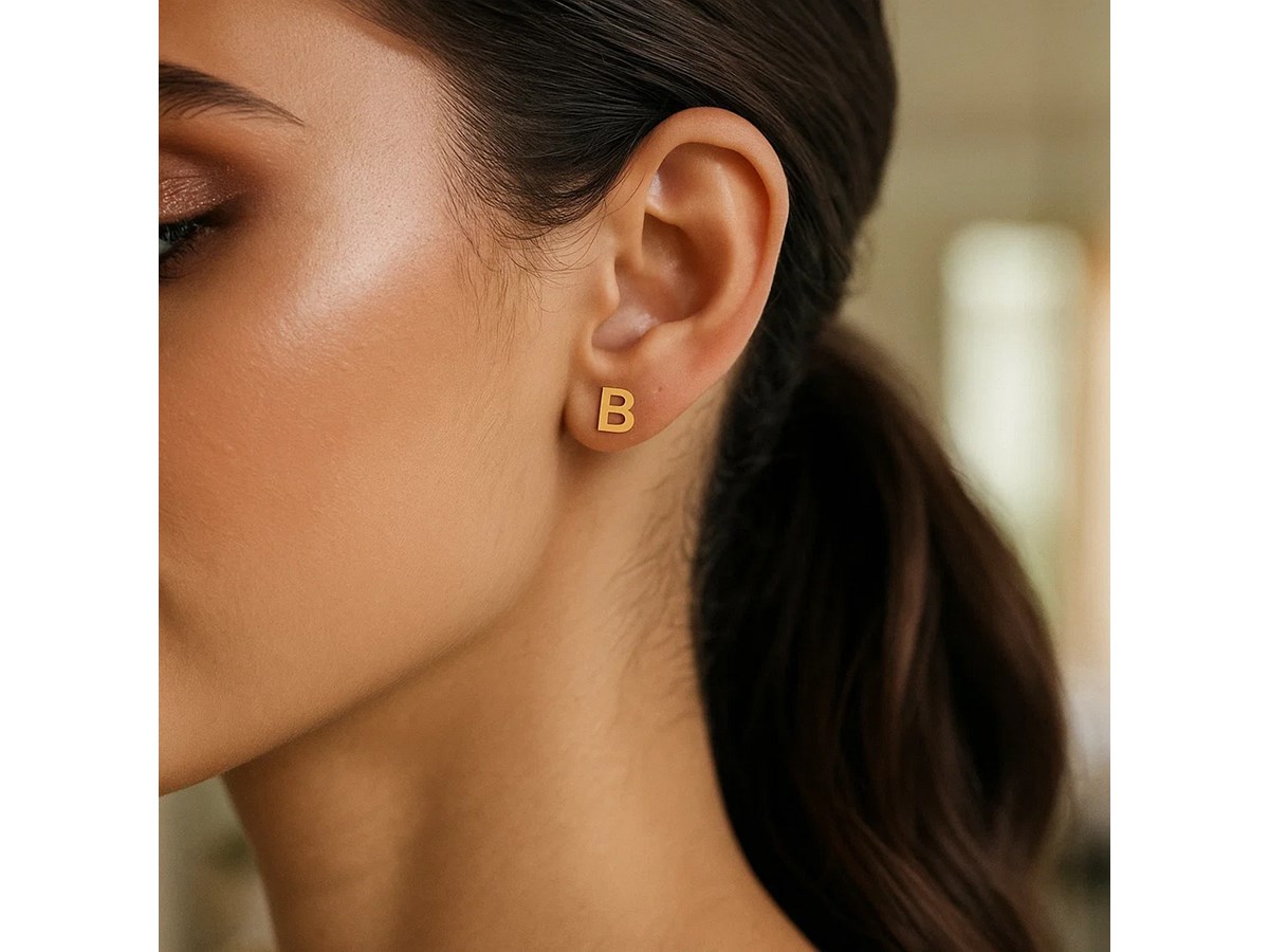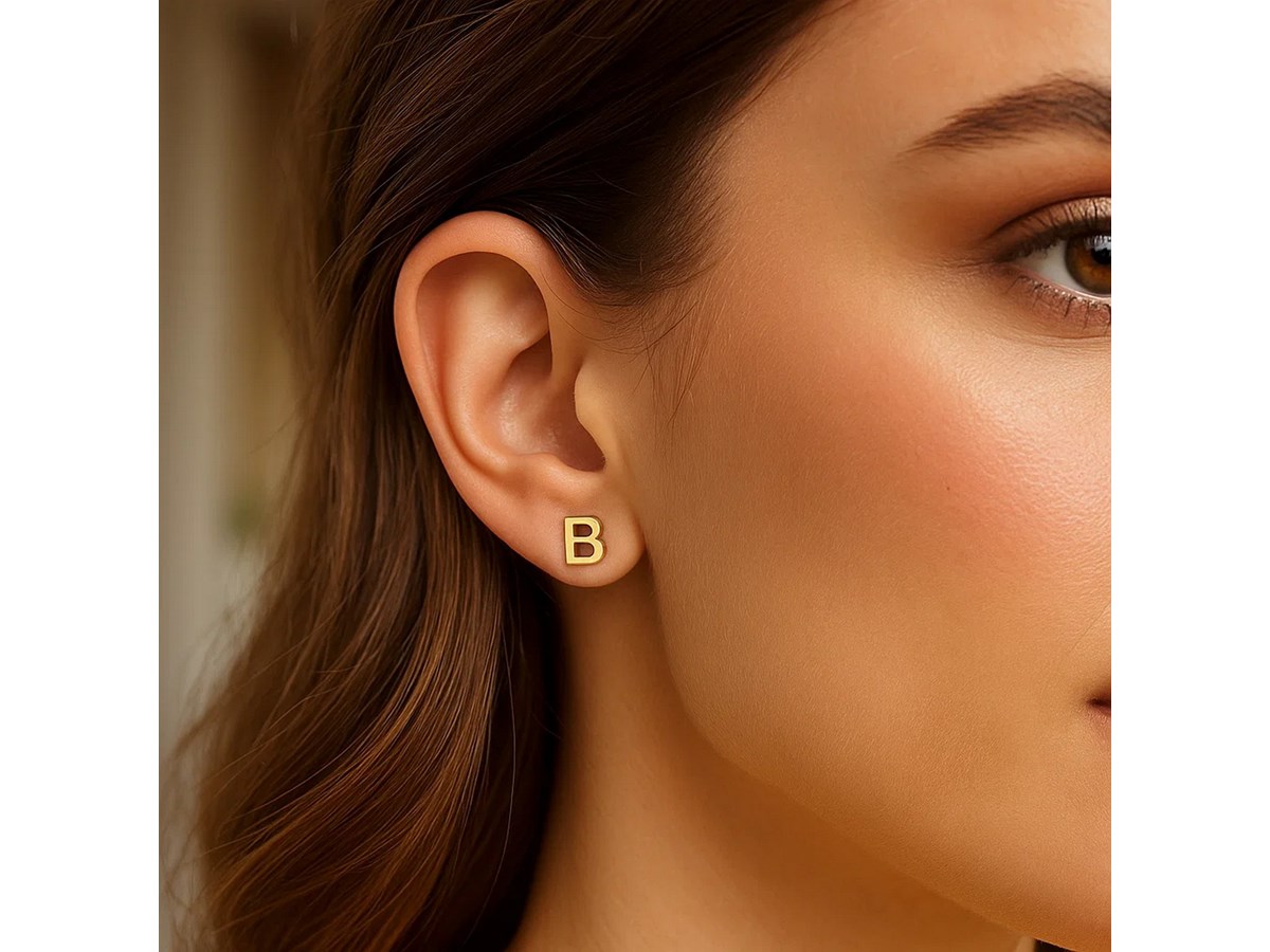 Delicate 14K yellow gold “Yours Truly” Initial B stud earring featuring a polished finish and minimalist design. This personalized piece adds a touch of elegance and meaning, perfect for everyday wear or gifting someone special.