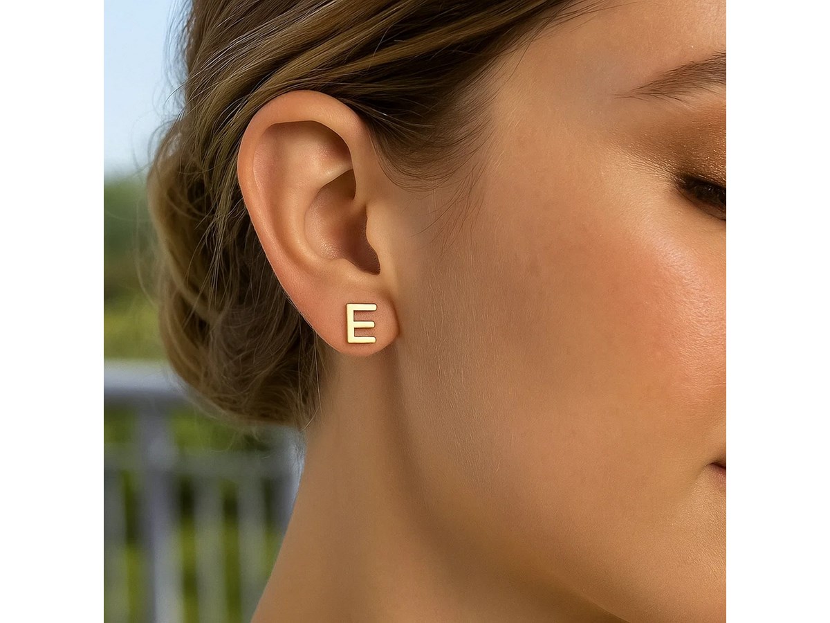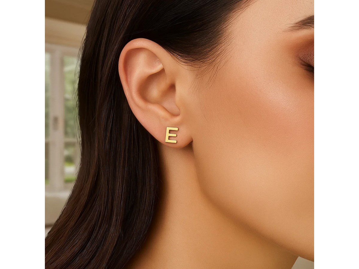 Delicate 14K yellow gold “Yours Truly” Initial E stud earring featuring a high-polish finish and minimalist design. This personalized piece adds elegance and meaning, making it a timeless accessory or a thoughtful gift for any occasion.