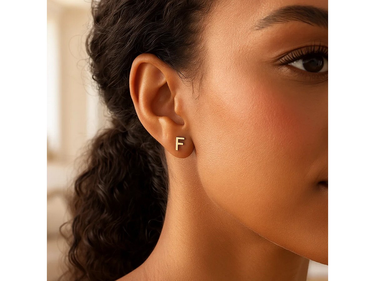 Delicate 14K yellow gold “Yours Truly” Initial F stud earring featuring a high-polish finish and minimalist design. This personalized piece adds elegance and meaning, making it a timeless accessory or a thoughtful gift for any occasion.